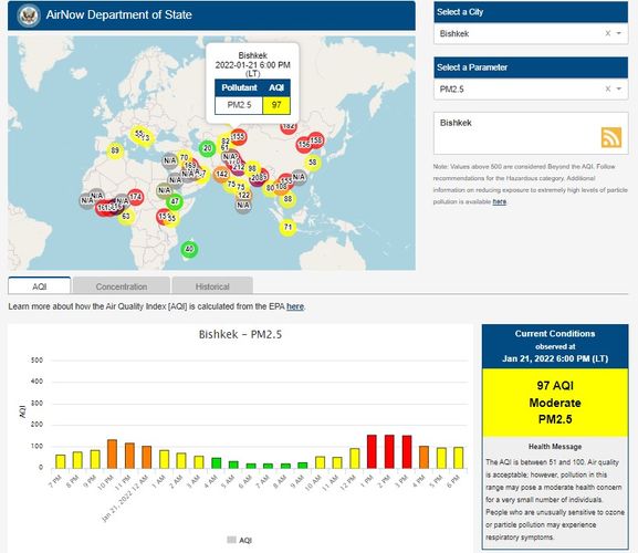 Посольство США в Кыргызстане также установило станцию. Информация обновляется каждый час. Индекс качества воздуха в районе дипломатической миссии — 50 (AQI).