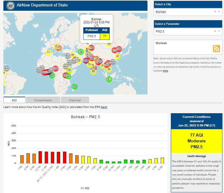 Посольство США в Кыргызстане также установило станцию. Информация обновляется каждый час. Индекс качества воздуха в районе дипломатической миссии — 77 (AQI).