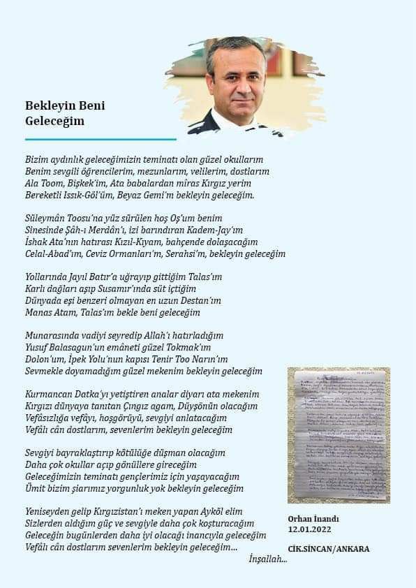 Орхан Инанды оформил свое послание, посвященное, как он отметил, родине, в форме стихотворения. Он обращается к своим ученикам, выпускникам, их родителям и друзьям, а также к кыргызскому народу и стране и просит всех ждать его и не терять надежду. Ниже приводим перевод стихотворения: