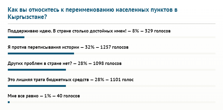 Почти треть респондентов (или 1 тысяча 257 голосов) против переписывания истории. Чуть меньше (28 процентов, или 1,1 тысячи голосов) считают переименование лишней тратой бюджетных средств. Столько же проголосовавших задались вопросом, неужели в стране нет других проблем.