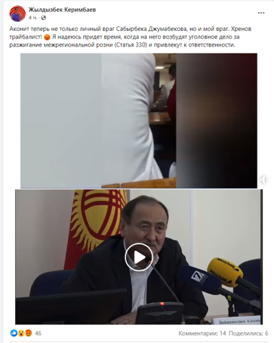 «Я же сказал, что все — весь народ знает, что Сабырбек Джумабеков набрал таласских на работу. Это же не секрет. Я сказал, чтобы привести в порядок научно-исследовательский центр, там должен быть нейтральный человек. Например, как Гулия Кожомкулова. Я не регионалист и отвечаю за свои слова. Я извинился за то, что сказал, что он набрал таласских. Имел в виду родственников. В отличие от него я никогда не набирал никого из близких на работу. А когда говорю аферист, называю конкретные имена. Не обобщал», — заключил министр.