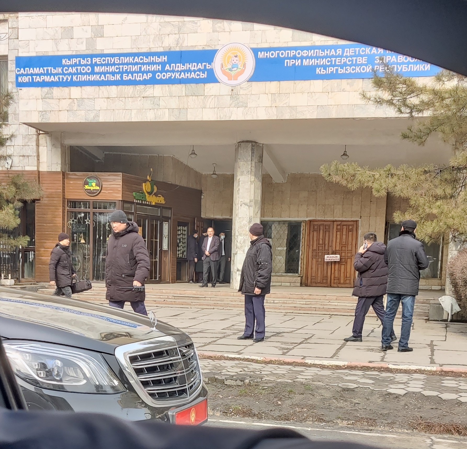 Президент Садыр Жапаров и глава Минздрава Алымкадыр Бейшеналиев посетили Многопрофильную детскую больницу (Республиканский диагностический центр). Фотографию в своем аккаунте в Twitter опубликовала Умай Арыкова.