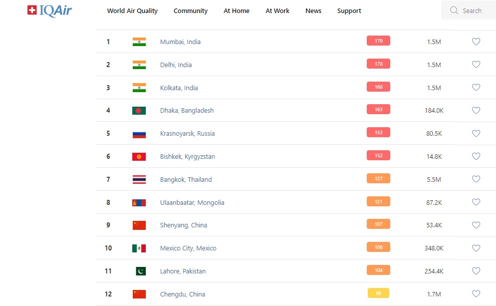 В рейтинге крупнейших городов мира по качеству воздуха World Air Quality Бишкек поднялся на 6-е место.
