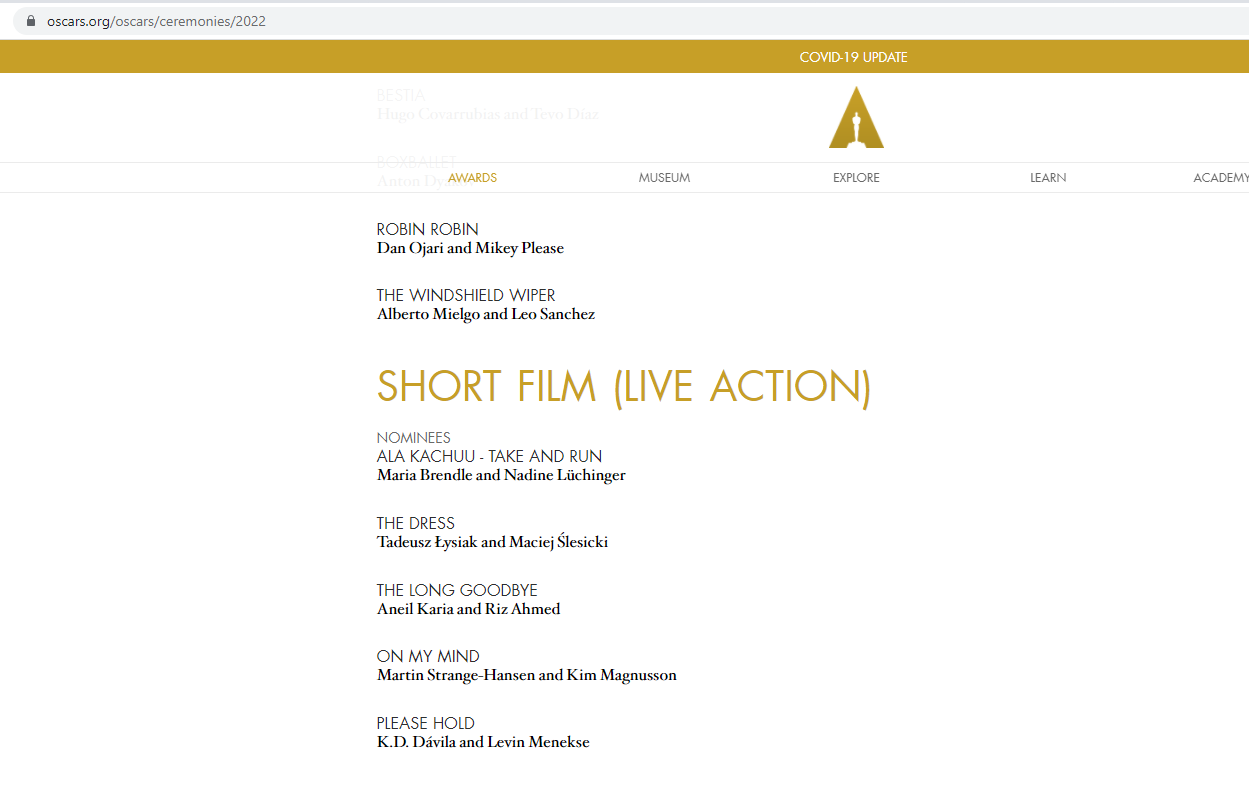 Лента, снятая немецким режиссером Марией Брендл, будет бороться за «Оскар» в категории «Лучший короткометражный фильм» с четырьмя другими номинантами. Имя победителя станет известно 27 марта на церемонии вручения самой знаменитой кинопремии мира.