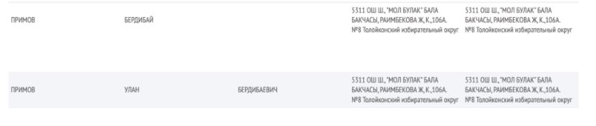 Согласно данным портала «Тизме», в Оше прописан только один человек с фамилией Примов и именем, начинающимся на букву «Б» — это Бердибай Примов, отец Улана Примова. И прописаны оба на одном и том же избирательном участке.