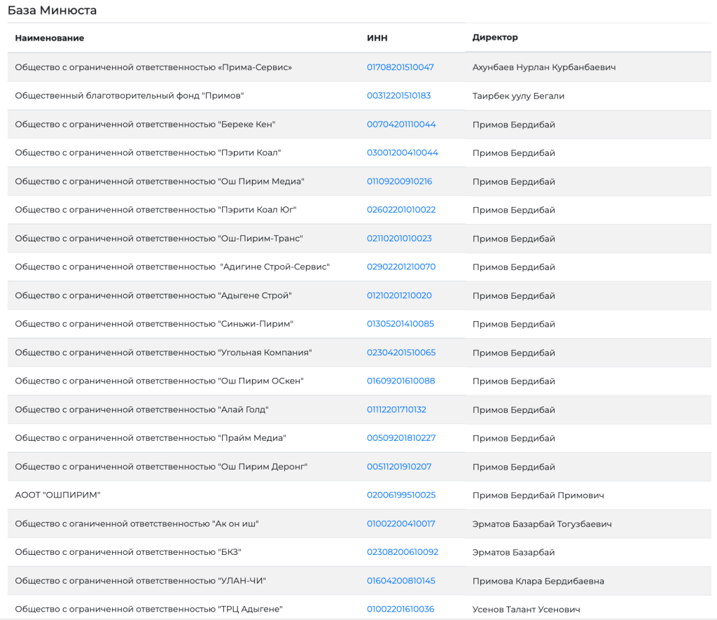 Отметим, что по данным osoo.kg, на Бердибая Примова зарегистрировано 16 действующих компаний в Оше и Ошской области, а также в Бишкеке, Чуйской и Баткенской областях. Компании занимаются добычей угля, известняка, строительством, торговлей автомобилями, есть даже радиовещательная компания (очевидно речь идет о ТРК «Ош-Пирим». — Прим. 24-kg.com). Как минимум три фирмы занимаются производством кирпича и черепицы.
