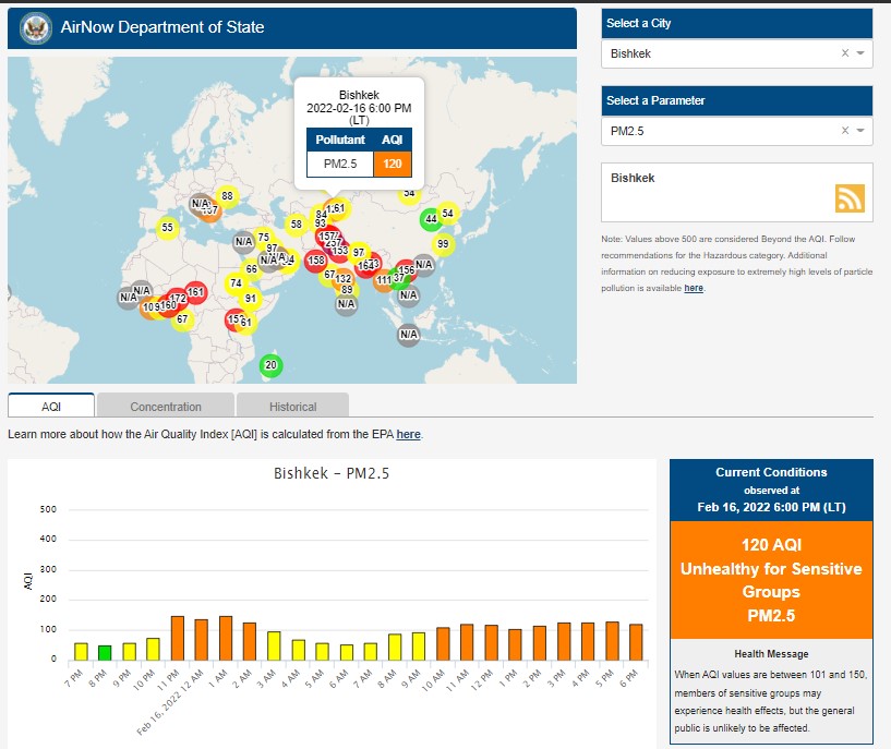 Посольство США в Кыргызстане также установило станцию. Информация обновляется каждый час. Индекс качества воздуха в районе дипломатической миссии — 120 (AQI).