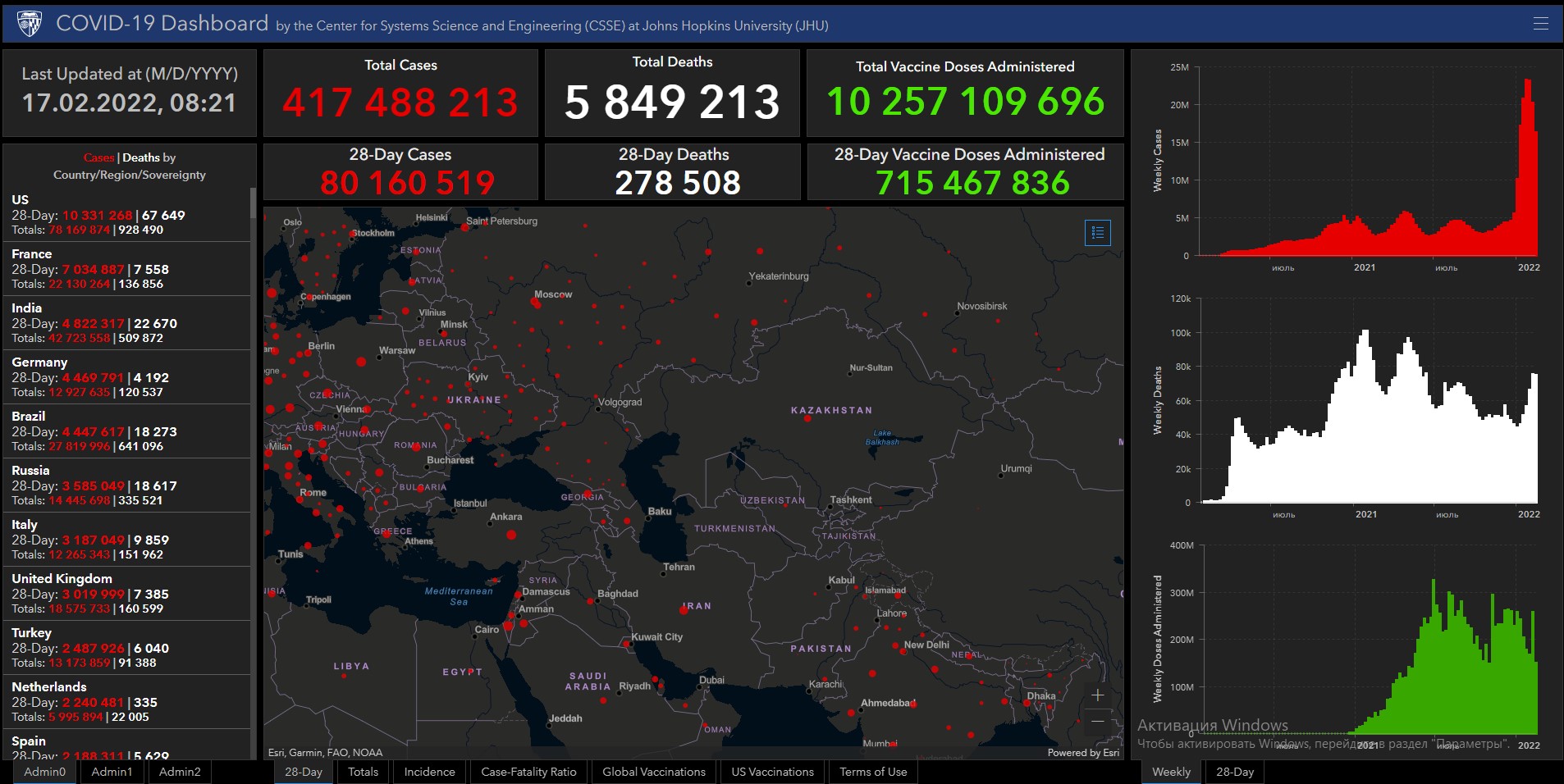 Всего в мире коронавирусом заразились 417 миллионов 488 тысяч 213 человек. Больше всего зараженных в США (78 миллионов 169 тысяч 874), Индии (42 миллиона 723 тысячи 558), Бразилии (27 миллионов 819 тысяч 996), Франции (22 миллиона 130 тысяч 264), Великобритании (18 миллионов 575 тысяч 733), России (14 миллионов 445 тысяч 698), Турции (13 миллионов 173 тысячи 859), Аргентине (8 миллионов 783 тысячи 208), Иране (6 миллионов 876 тысяч 565), Колумбии (6 миллионов 31 тысяча 130), Испании (10 миллионов 744 тысячи 394), Италии (12 миллионов 265 тысяч 343) и Германии (12 миллионов 927 тысяч 635).