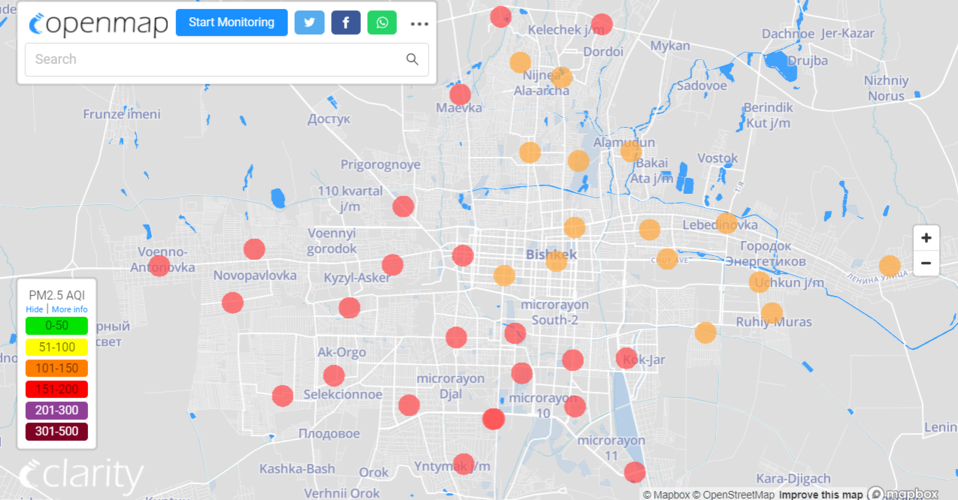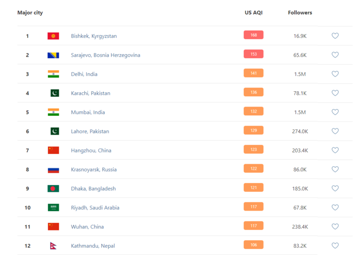 В рейтинге крупнейших городов мира по качеству воздуха World Air Quality Бишкек находится на 1-м месте.