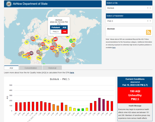 Посольство США в Кыргызстане также установило станцию. Информация обновляется каждый час. Индекс качества воздуха в районе дипломатической миссии — 173 (AQI).