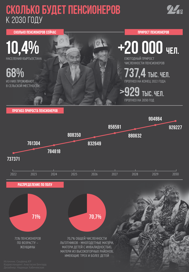 Ежегодно в Кыргызстане численность пенсионеров в среднем увеличивается на 20 тысяч человек. К концу 2030-го, по прогнозам Социального фонда, их будет более 900 тысяч. Сможет ли государство обеспечить всех достойными пенсиями? В условиях высокой неформальной экономики и отказа молодежи платить налоги и делать отчисления на свою же старость есть серьезные риски.