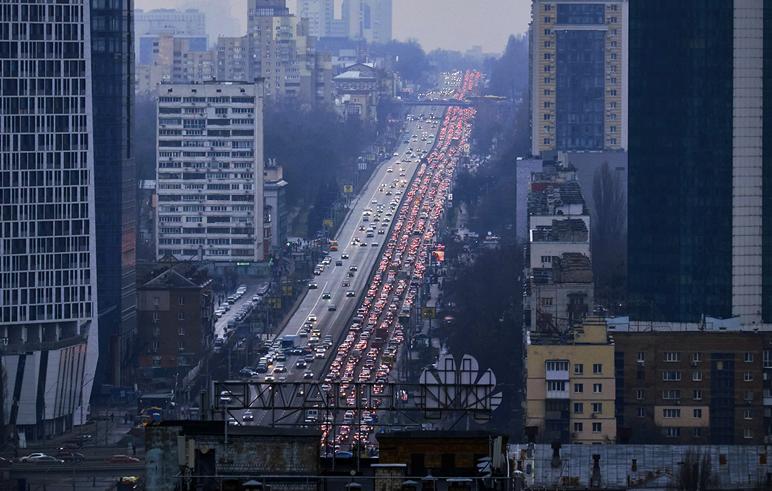 По данным украинской телевизионной службы новостей «ТСН», плотное движение наблюдается с 6.00, когда киевляне услышали серию массированных взрывов.