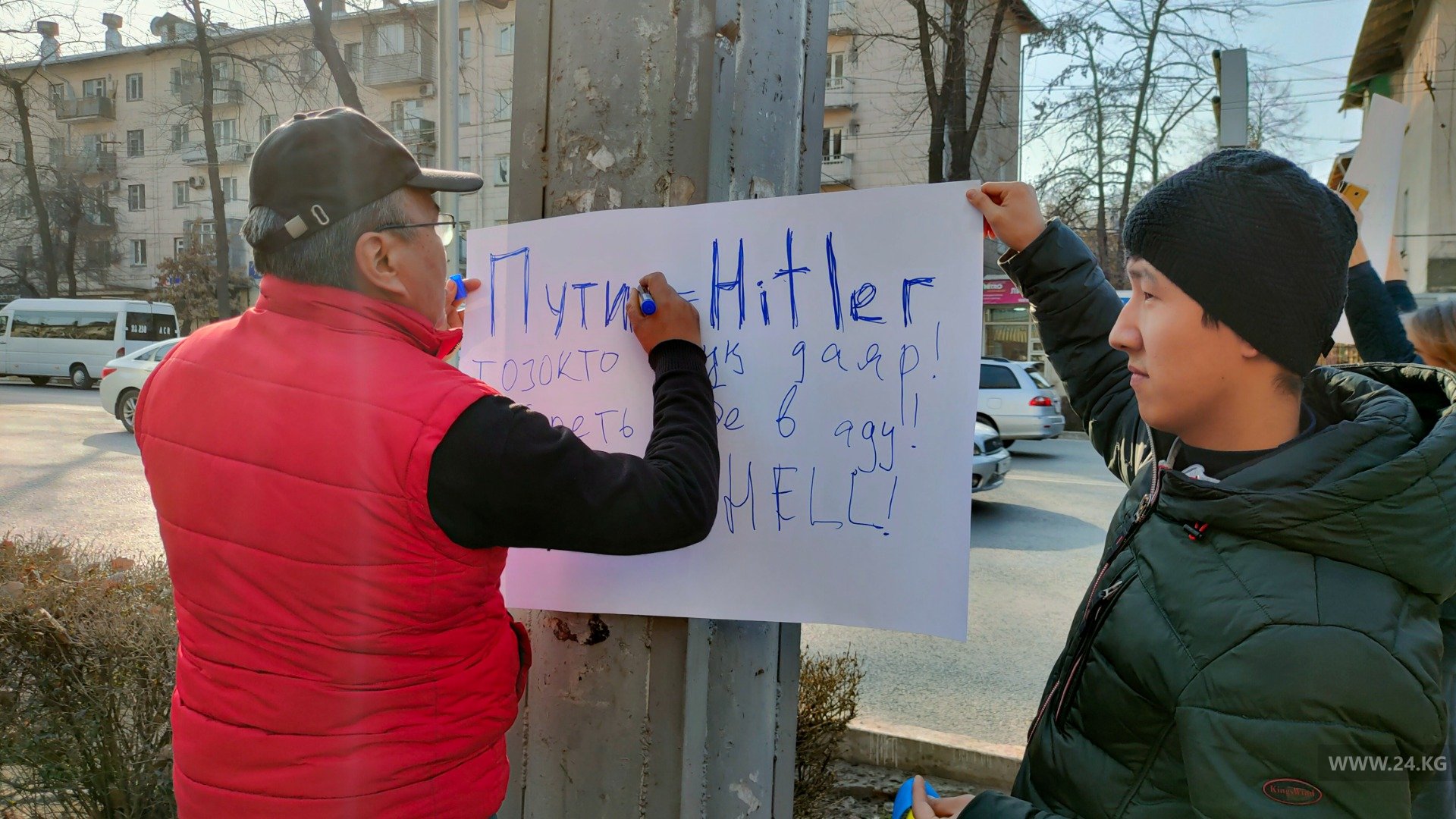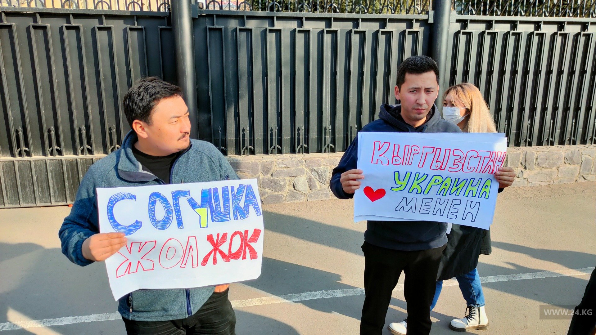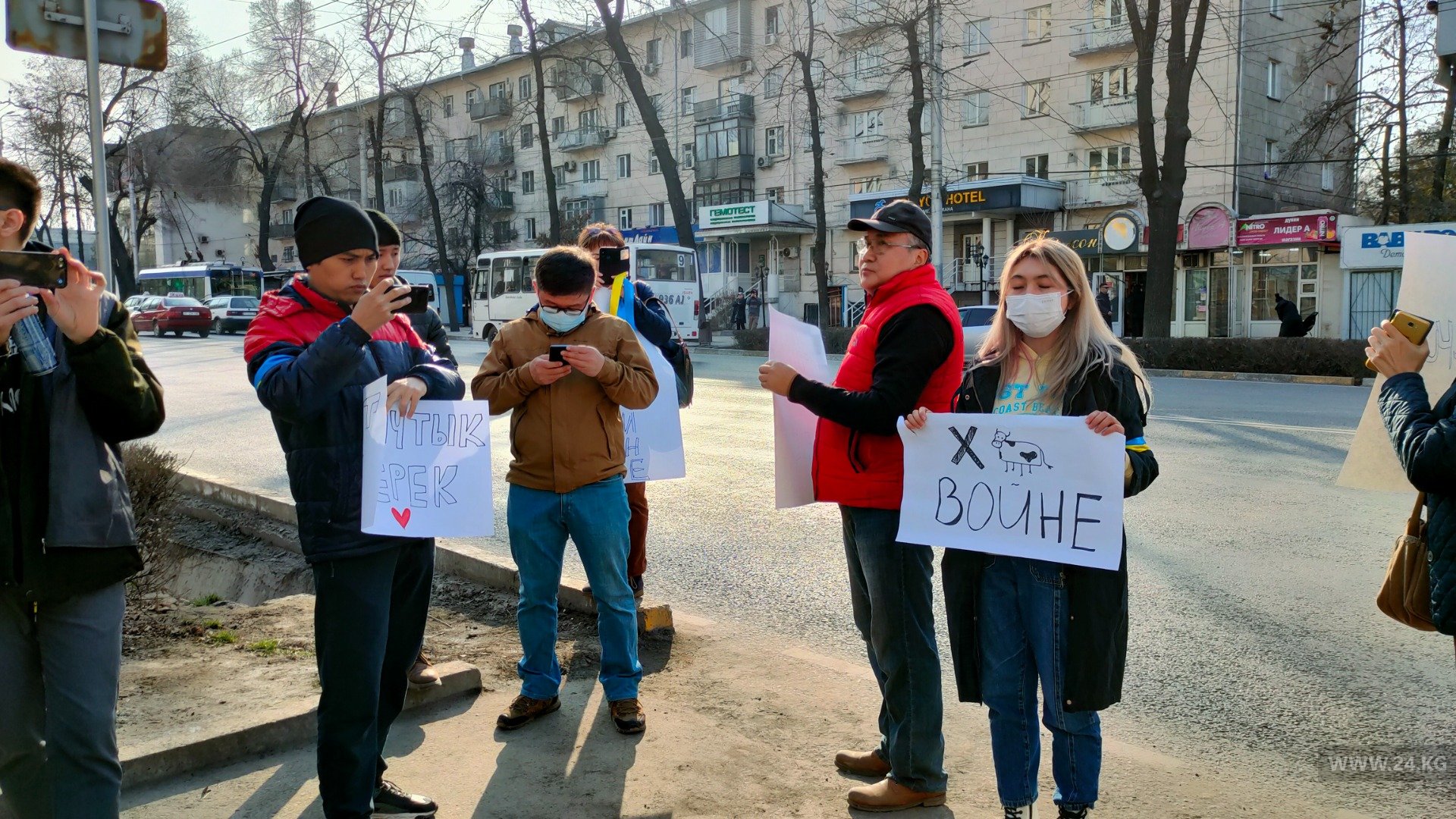 На акцию протеста вышли примерно десять горожан. Они держат плакаты с надписями: «Нет дороги войне» и «Кыргызстан с Украиной».