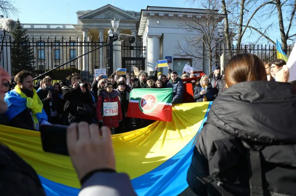 У посольства России в столице Польши городе Варшаве тоже собрались несколько десятков человек выступающих против военных действий.