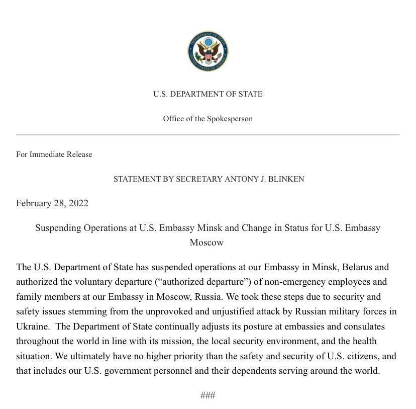 Госдеп объявил о приостановке работы посольства США в Минске и разрешении на добровольный выезд из России сотрудников диппредставительства в Москве. Такие шаги, как отмечается, предприняты из-за проблем безопасности, связанных с действиями РФ в Украине.«Империя лжи»