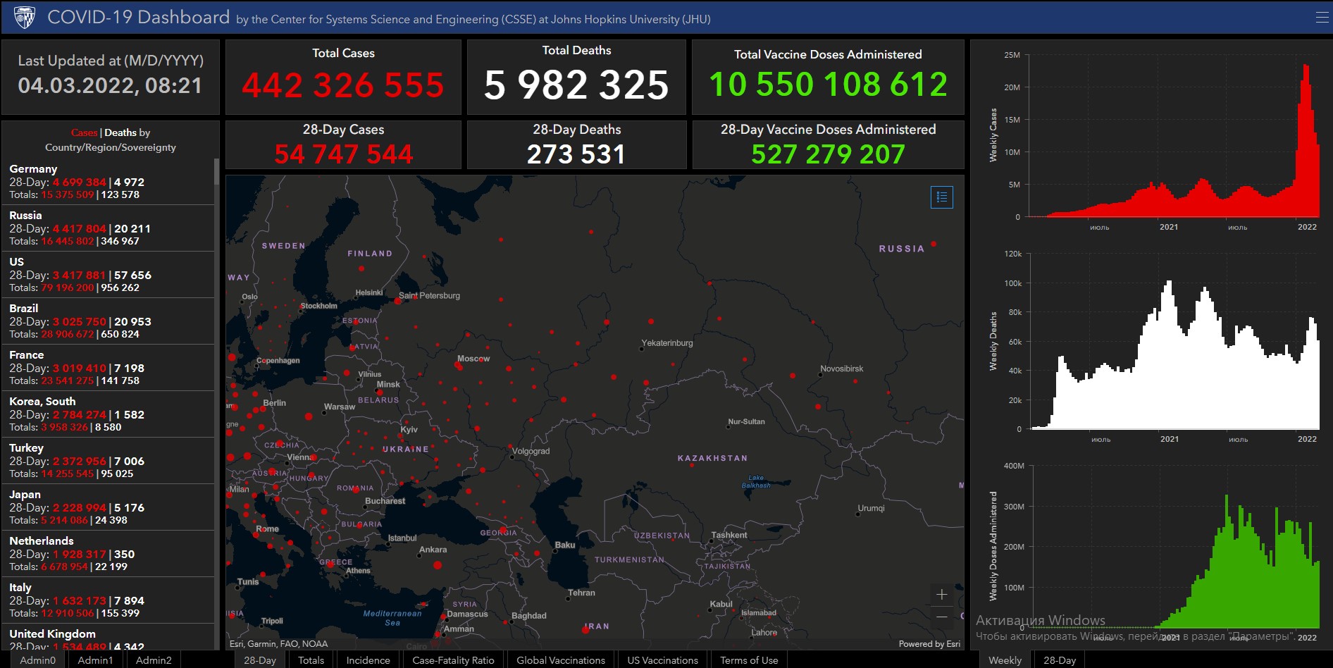 Всего в мире коронавирусом заразились 440 миллионов 326 тысяч 555 человек. Больше всего зараженных в США (79 миллионов 196 тысяч 200), Индии (42 миллиона 945 тысяч 160), Бразилии (28 миллионов 906 тысяч 672), Франции (23 миллиона 541 тысяча 275), Великобритании (19 миллионов 211 тысяч 944), России (16 миллионов 445 тысяч 802), Турции (14 миллионов 255 тысяч 545), Аргентине (8 миллионов 921 тысяча 536), Иране (7 миллионов 73 тысячи 747), Колумбии (6 миллионов 68 тысяч 74), Испании (11 миллионов 78 тысяч 28), Италии (12 миллионов 910 тысяч 506) и Германии (15 миллионов 375 тысяч 509).
