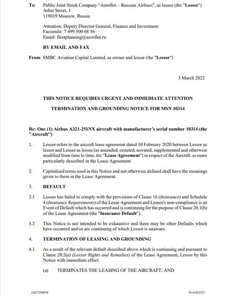 Самолеты российской авиакомпании «Аэрофлот», вероятно, не смогут летать в Кыргызстан. Такой вывод можно сделать из письма авиационной лизинговой компании SMBC AVIATION CAPITAL LIMITED, направленного российскому авиаперевозчику. Уведомление за подписью директора компании Дэвида Свена есть в распоряжении редакции 24-kg.com.