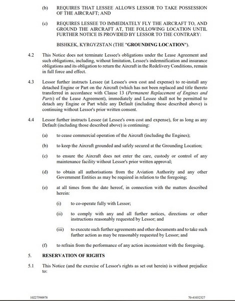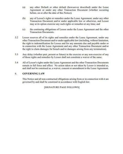 В письме говорится, что арендатор нарушил положения пункта 16 (страхование) и приложения 4 (страховые требования) договора аренды. Несоблюдение арендатором данных положений является случаем неисполнения обязательств, которое произошло и продолжается применительно к пункту 20.1(b) договора аренды («Неисполнение страховых обязательств»).
