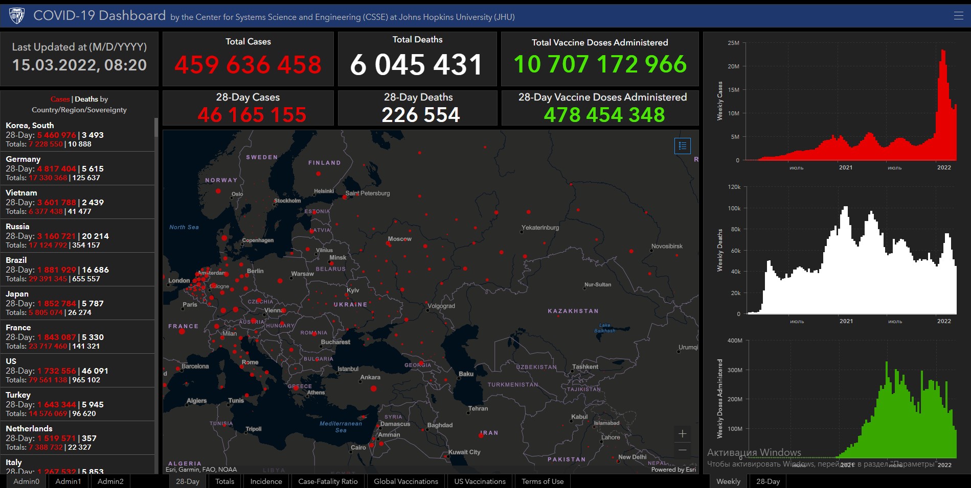 COVID-19 в мире. Заразились более 459,6 миллиона, умерли более 6 миллионов