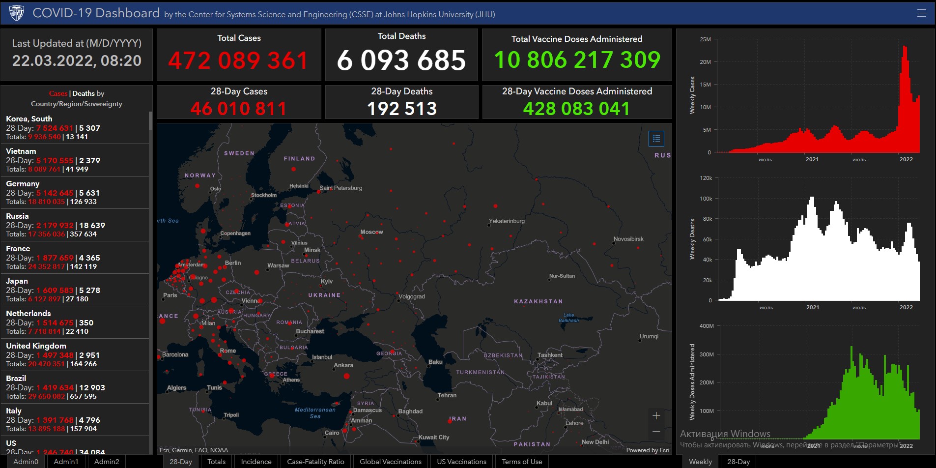 Всего в мире коронавирусом заразились 472 миллиона 89 тысяч 361 человек. Больше всего зараженных в США (79 миллионов 778 тысяч 522), Индии (43 миллиона 9 тысяч 390), Бразилии (29 миллионов 650 тысяч 82), Франции (24 миллиона 352 тысячи 817), Великобритании (20 миллионов 470 тысяч 351), России (17 миллионов 356 тысяч 36), Турции (14 миллионов 708 тысяч 850), Аргентине (9 миллионов 11 тысяч 367), Иране (7 миллионов 142 тысячи 287), Колумбии (6 миллионов 81 тысяча 6391), Испании (11 миллионов 324 тысячи 637), Италии (13 миллионов 895 тысяч 188) и Германии (18 миллионов 810 тысяч 35).