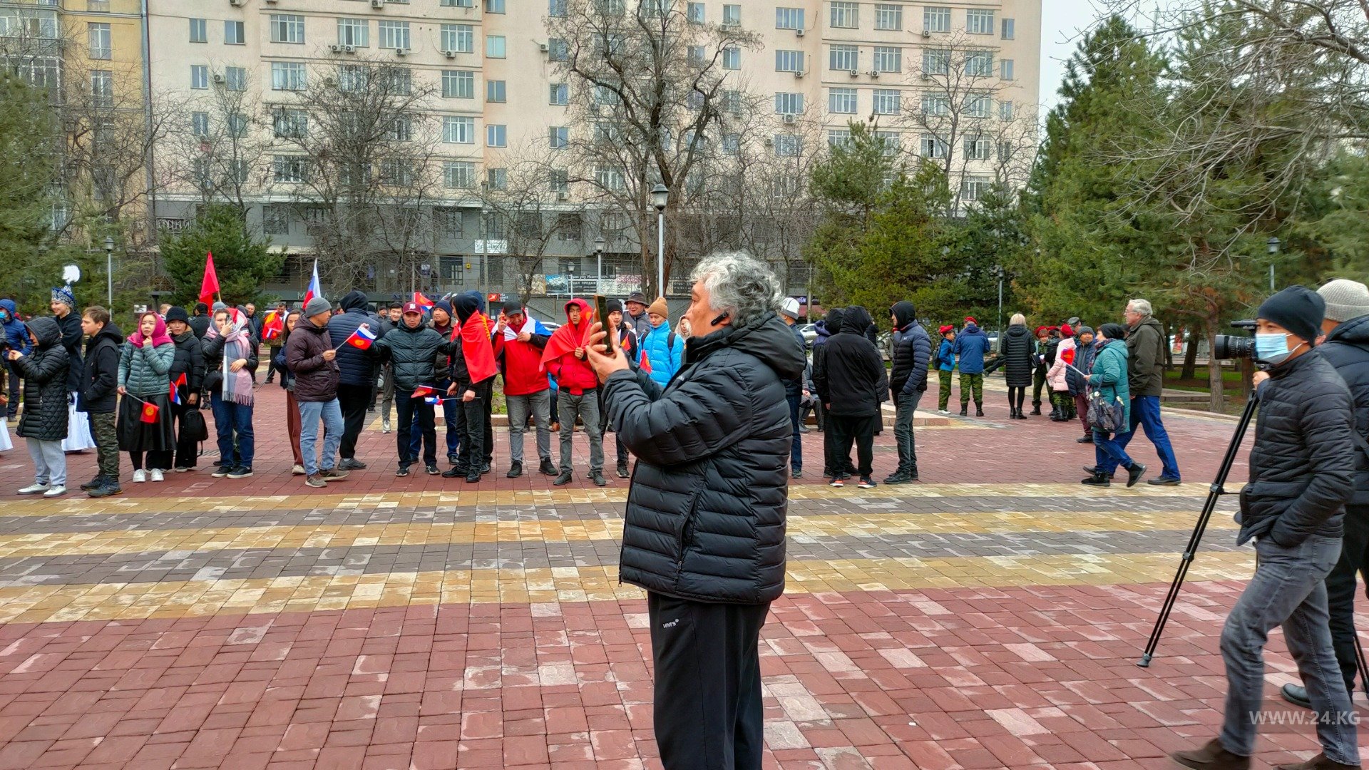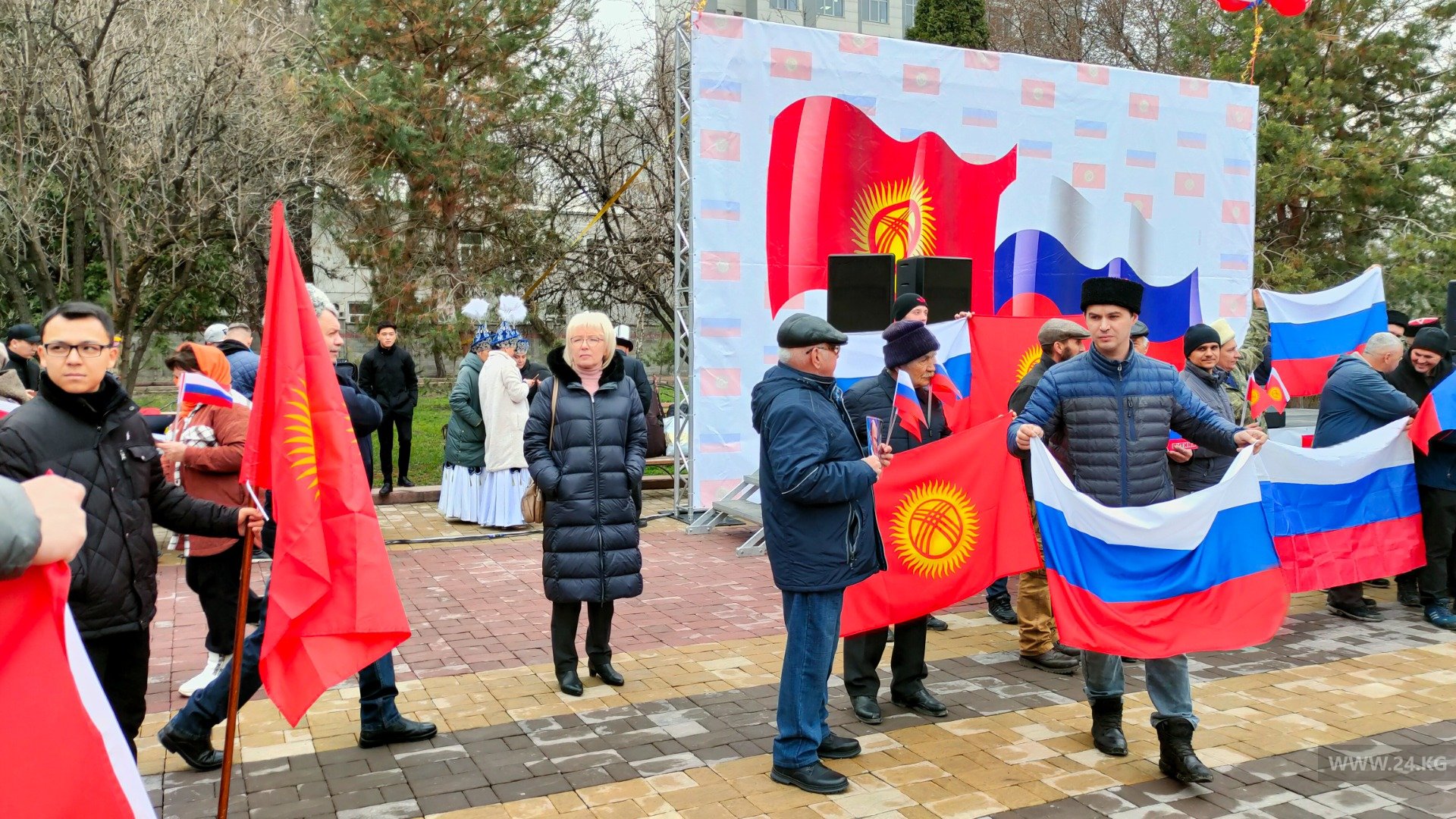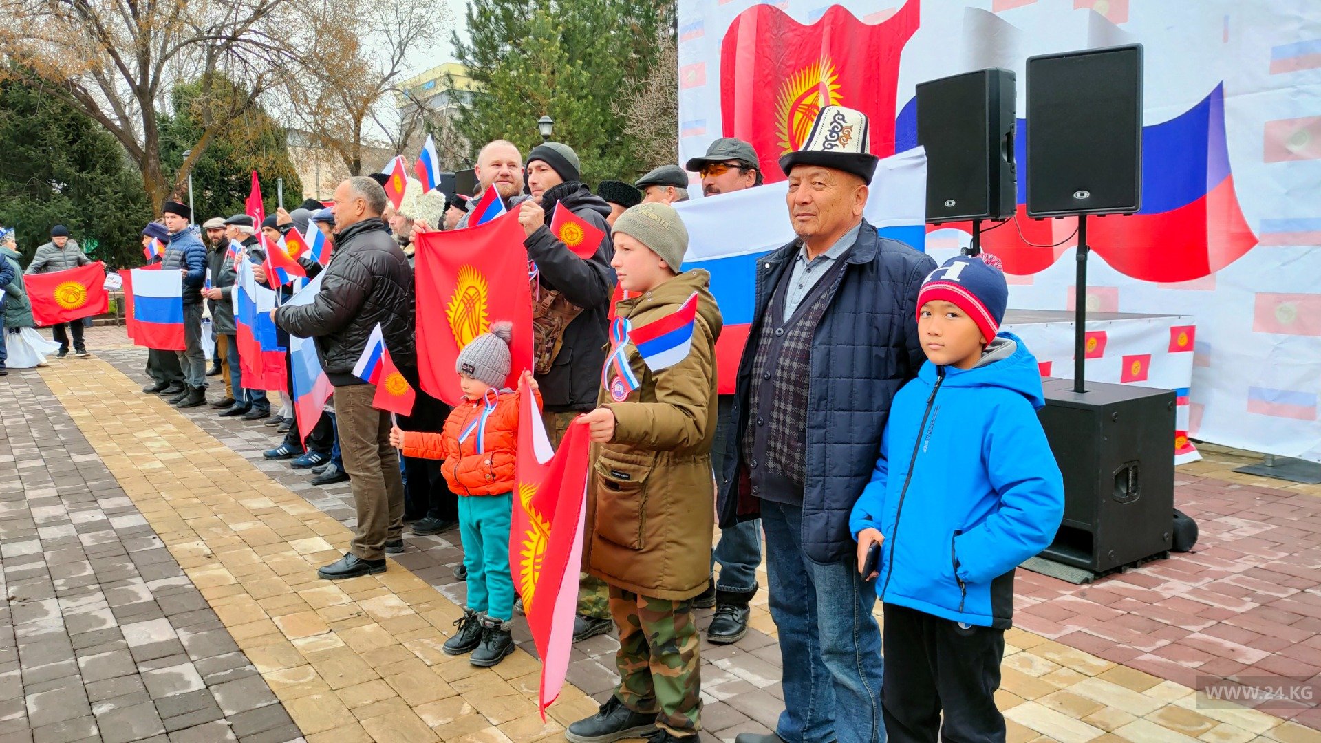 В сквере установили сцену, играет музыка. На акцию привели детей, они держат в руках флаги России и Кыргызстана. Однако пока не известно, кто их привел.