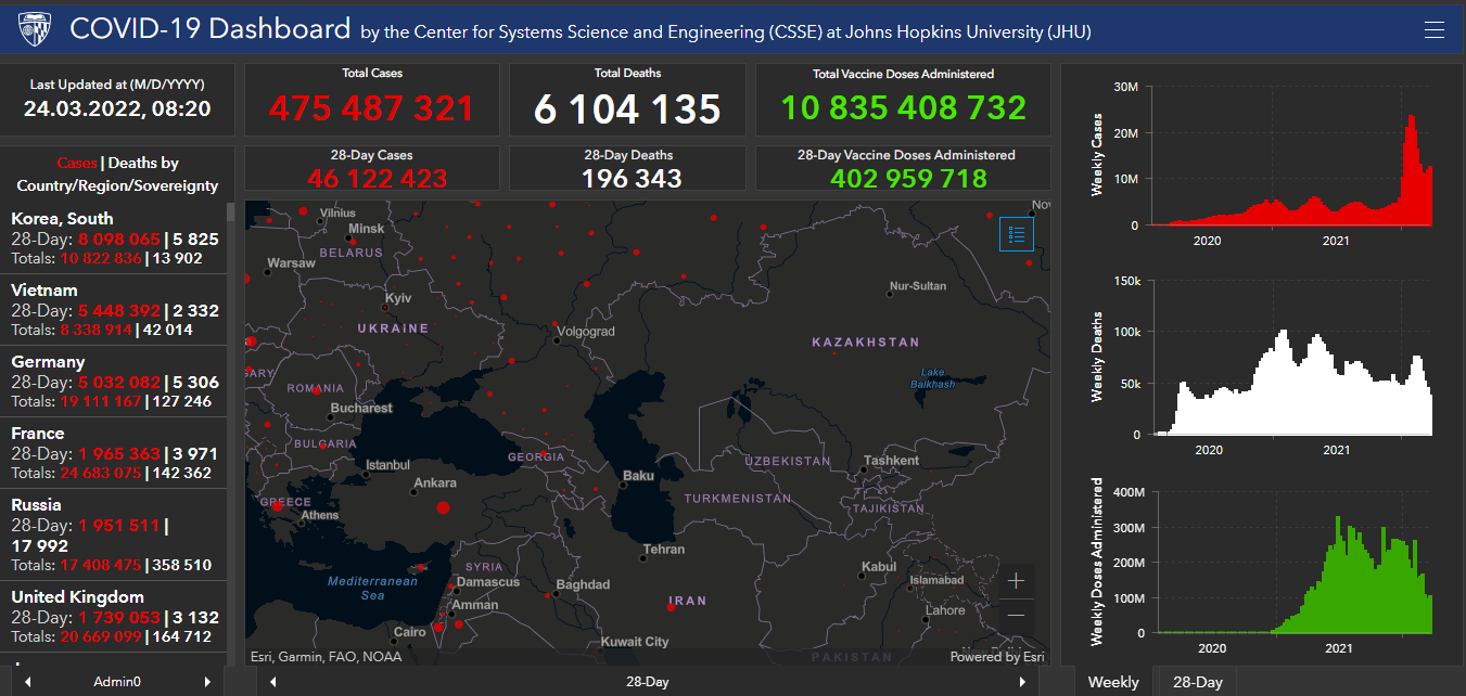 Всего в мире коронавирусом заразились 475 миллионов 487 тысяч 321 человек. Больше всего зараженных в США (79 миллионов 844 тысячи 364), Индии (43 миллиона 12 тысяч 749), Бразилии (29 миллионов 738 тысяч 362), Франции (24 миллиона 683 тысячи 75), Великобритании (20 миллионов 669 тысяч 99), России (17 миллионов 408 тысяч 475), Турции (14 миллионов 743 тысячи 437), Аргентине (9 миллионов 19 тысяч 660), Иране (7 миллионов 144 тысячи 532), Колумбии (6 миллионов 82 тысячи 226), Испании (11 миллионов 378 тысяч 784), Италии (14 миллионов 70 тысяч 450) и Германии (19 миллионов 111 тысяч 167).