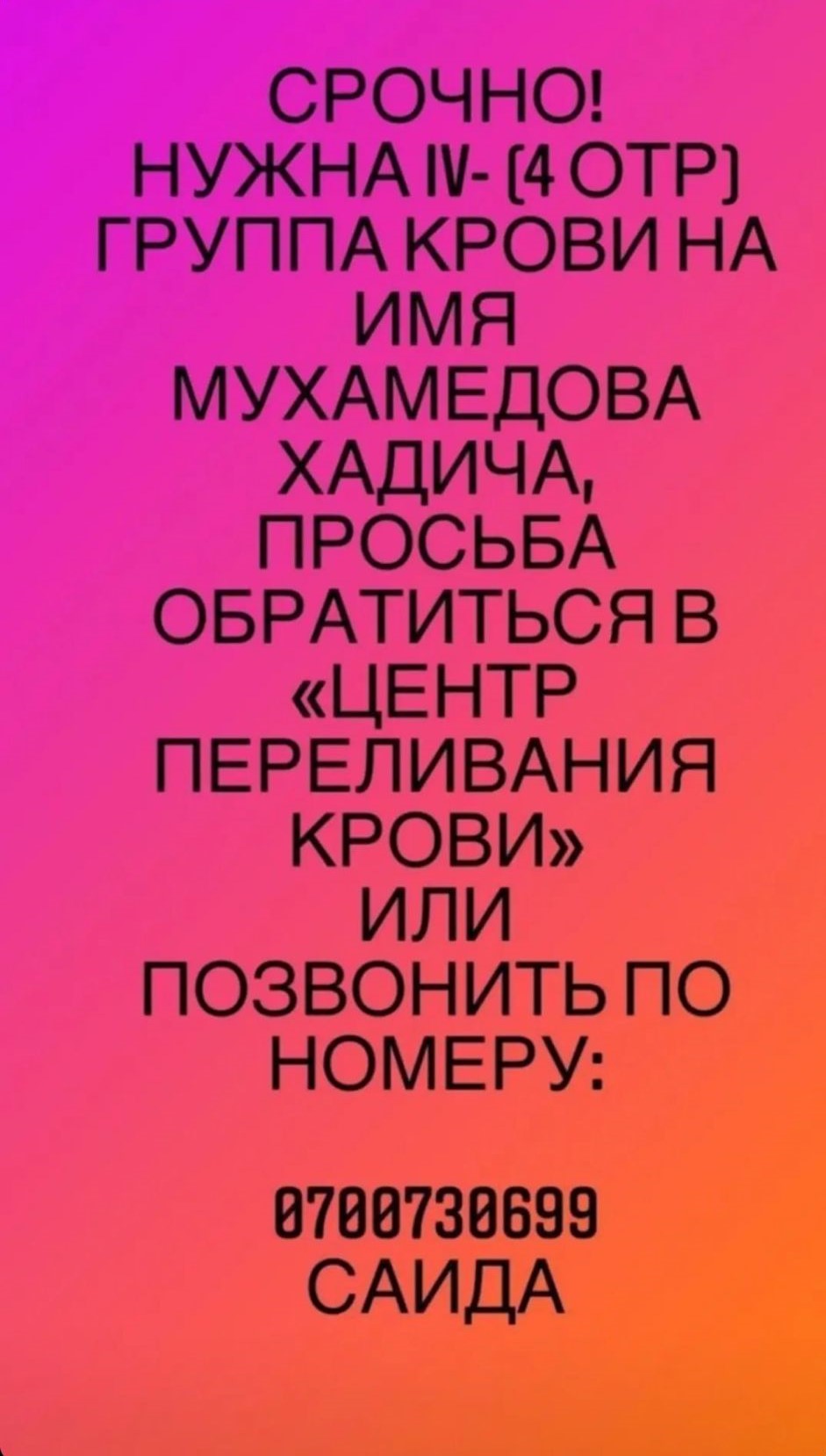 Она добавила, что группа крови АВ (IV) с отрицательным резусом является наиболее редкой, и попросила помочь неравнодушных. По вопросам можно обращаться по номеру +996700730699 или написать в Instagram @saida1777.