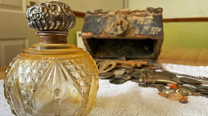 В сундуке также лежали драгоценные камни, ржавые карманные часы, старый флакон с духами, кольцо с печатью и серебряный спичкодержатель, на котором выгравировано имя Эрнест.