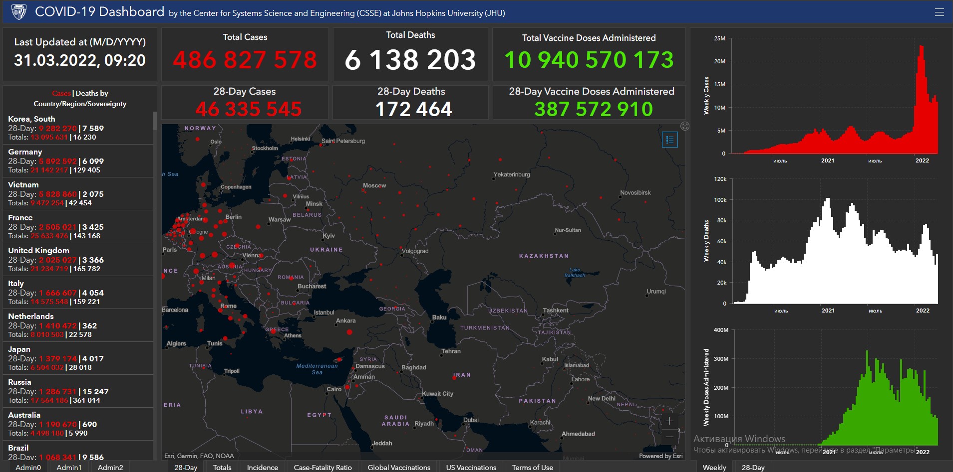 Всего в мире коронавирусом заразились 486 миллионов 827 тысяч 578 человек. Больше всего зараженных в США (80 миллионов 57 тысяч 126), Индии (43 миллиона 23 тысячи 215), Бразилии (29 миллионов 920 тысяч 604), Франции (25 миллионов 633 тысячи 476), Великобритании (21 миллион 234 тысячи 719), России (17 миллионов 564 тысячи 186), Турции (14 миллионов 846 тысяч 224), Аргентине (9 миллионов 35 тысяч 127), Иране (7 миллионов 159 тысяч 733), Колумбии (6 миллионов 84 тысячи 551), Испании (11 миллионов 508 тысяч 309), Италии (14 миллионов 575 тысяч 548) и Германии (21 миллион 142 тысячи 217).