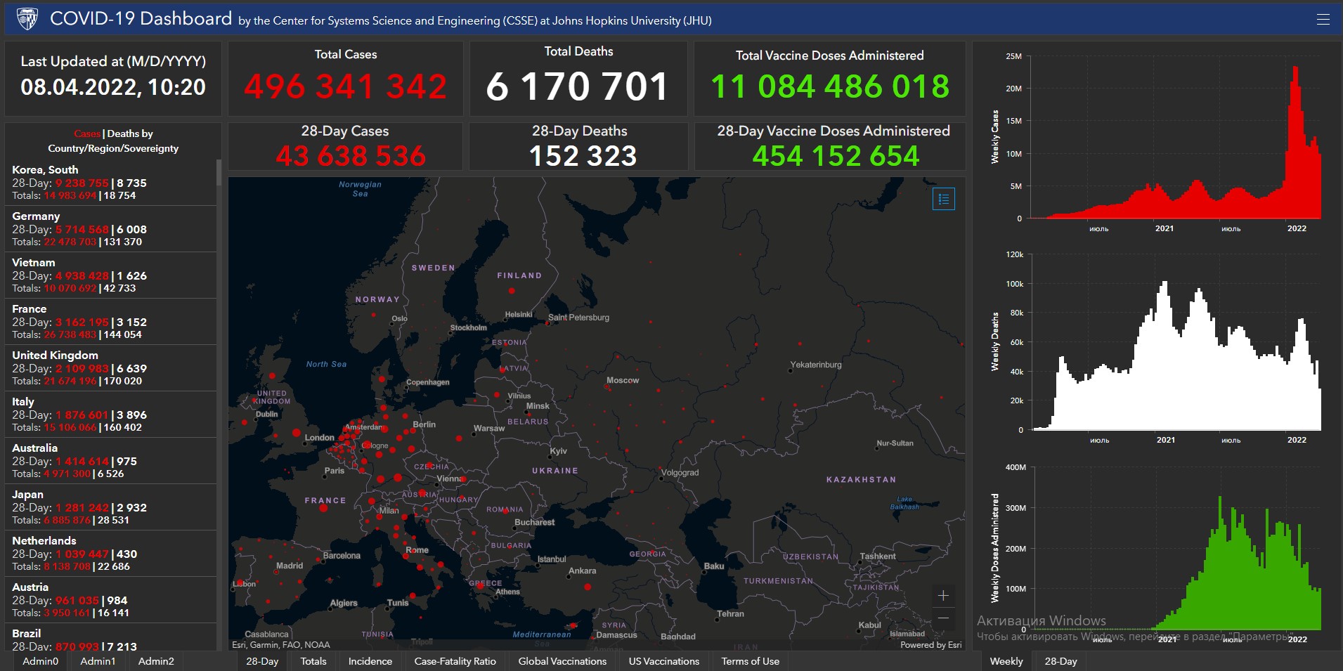 Всего в мире коронавирусом заразились 496 миллионов 341 тысяча 342 человека. Больше всего зараженных в США (80 миллионов 289 тысяч 237), Индии (43 миллиона 33 тысячи 67), Бразилии (30 миллионов 95 тысяч 328), Франции (26 миллионов 738 тысяч 483), Великобритании (21 миллион 674 тысячи 196), России (17 миллионов 693 тысячи 468), Турции (14 миллионов 939 тысяч 259), Аргентине (9 миллионов 49 тысяч 250), Иране (7 миллионов 183 тысячи 808), Колумбии (6 миллионов 87 тысяч 123), Испании (11 миллионов 551 тысяча 574), Италии (15 миллионов 106 тысяч 66) и Германии (22 миллиона 478 тысяч 703).