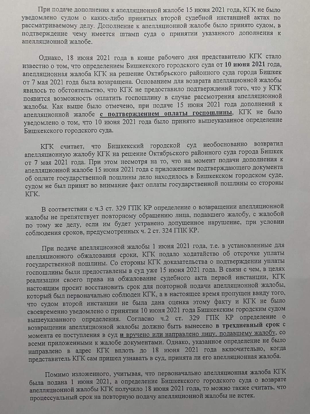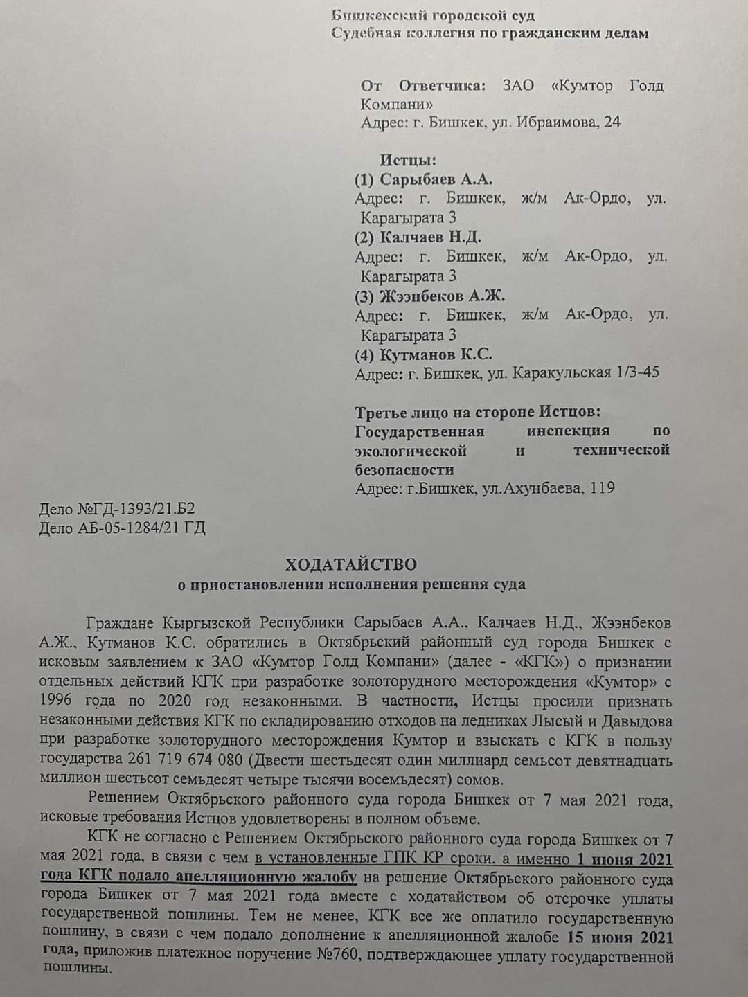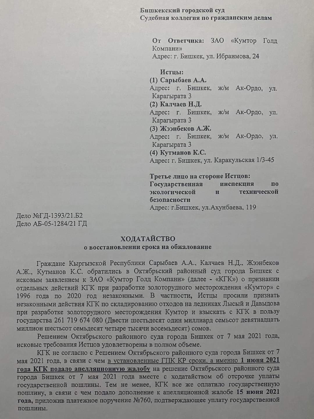 «Бишкекский городской суд вернул компании апелляционную жалобу. Она подала кассационную жалобу в Верховный суд по восстановлению права на обжалование решения первой инстанции. Это прошение было удовлетворено и апелляционная жалоба была возвращена во вторую инстанцию. Вчера Бишкекский горсуд удовлетворил прошение ЗАО «Кумтор голд компани» о том, чтобы отсрочить выплату государственной пошлины на два месяца. Суд целый год не рассматривал это дело. Но вчера судья Бермет Толубаева одним решением удовлетворила и сроки обжалования, и прошение об отсрочке выплаты госпошлины. Мы считаем, что это решение необснованно. Процесс по обжалованию штрафа назначен на следующую неделю», — сказал Наристе Калчаев.