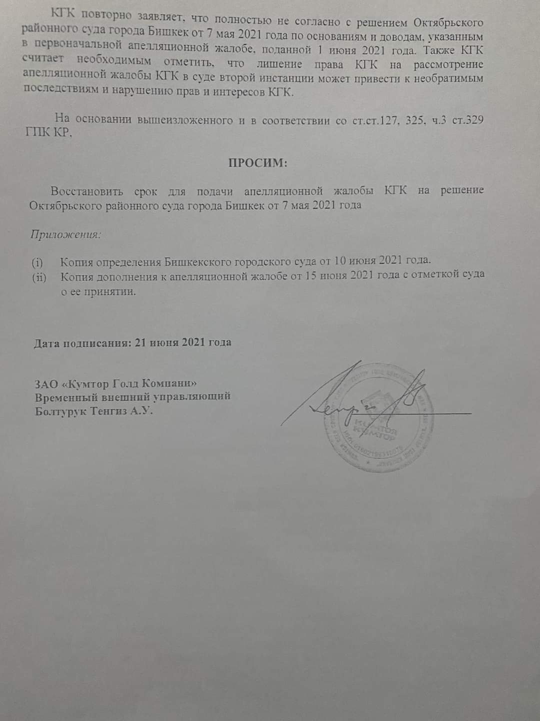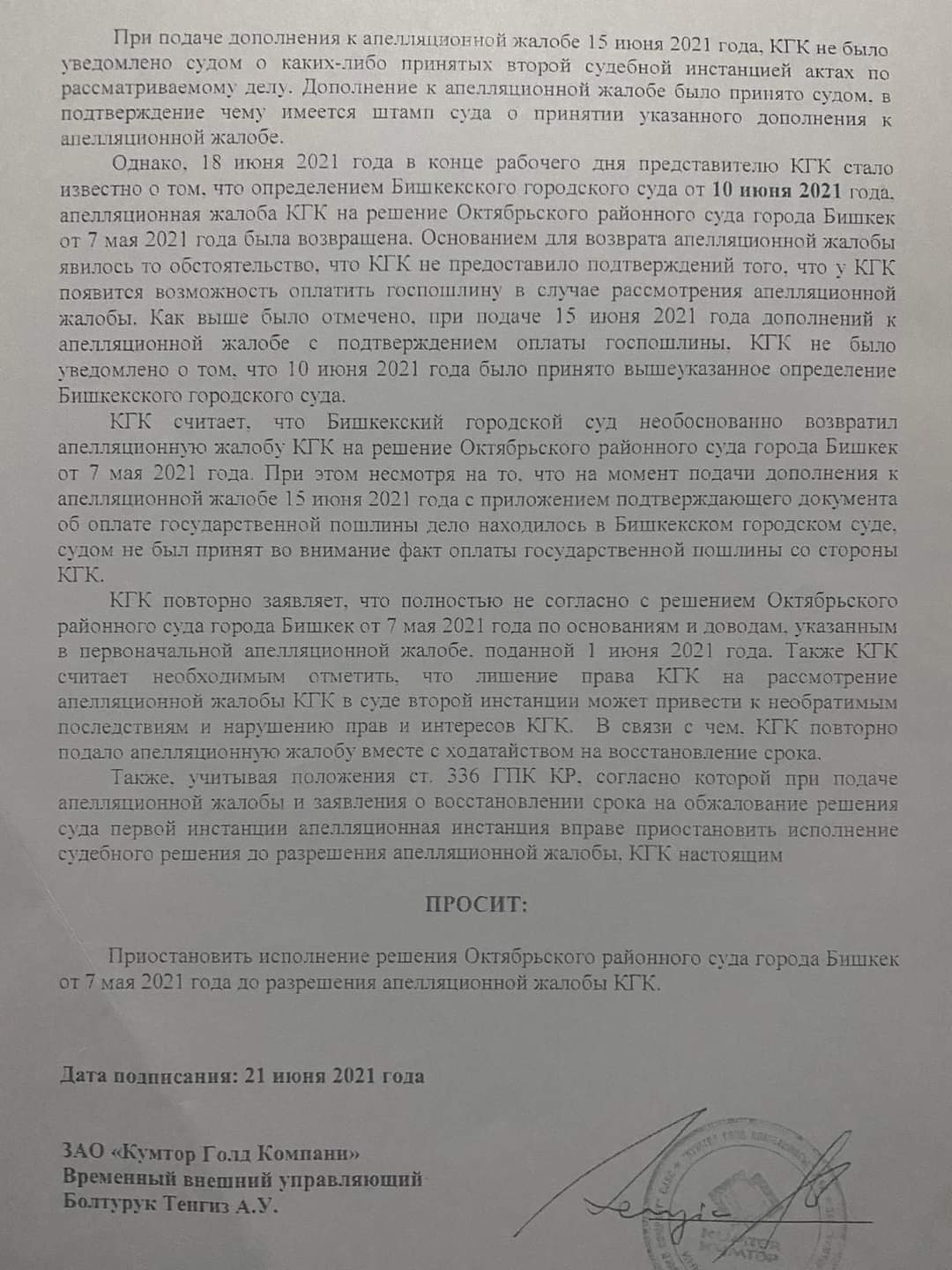 Документ подписан внешним управляющим «Кумтор голд компани» Тенгизом Болтуруком.
