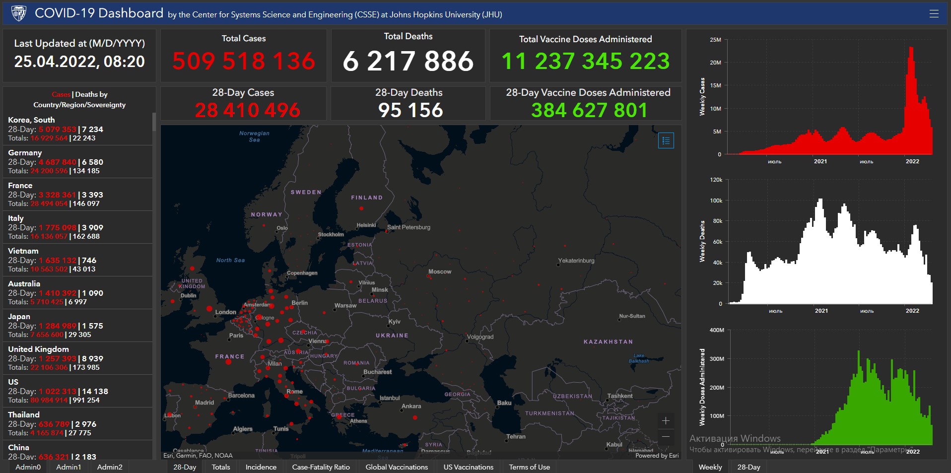 Всего в мире коронавирусом заразились 509 миллионов 518 тысяч 136 человек. Больше всего зараженных в США (80 миллионов 984 тысячи 914), Индии (43 миллиона 57 тысяч 545), Бразилии (30 миллионов 349 тысяч 463), Франции (28 миллионов 494 тысячи 54), Великобритании (22 миллиона 106 тысяч 306), России (17 миллионов 872 тысячи 625), Турции (15 миллионов 18 тысяч 547), Аргентине (9 миллионов 60 тысяч 923), Иране (7 миллионов 216 тысяч 40), Колумбии (6 миллионов 91 тысяча 343), Испании (11 миллионов 736 тысяч 893), Италии (16 миллионов 136 тысяч 57) и Германии (24 миллиона 200 тысяч 596).