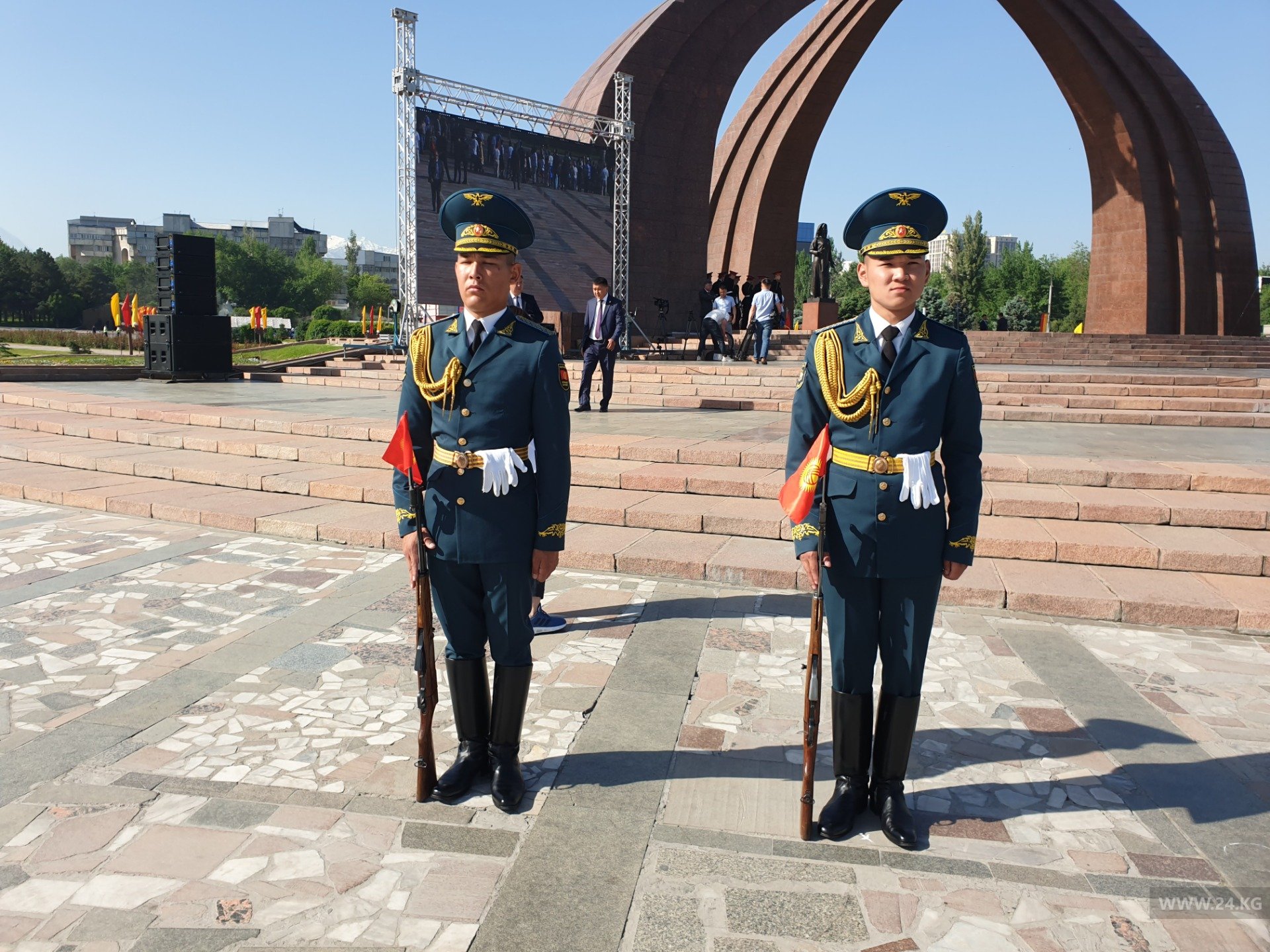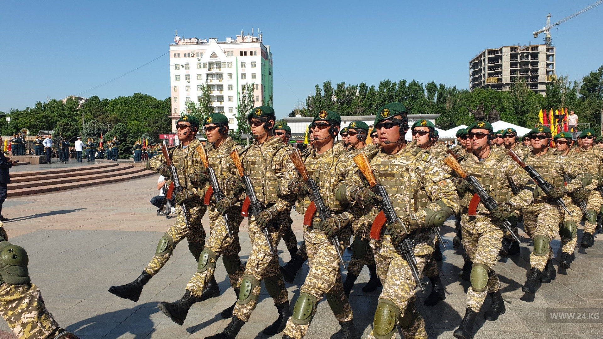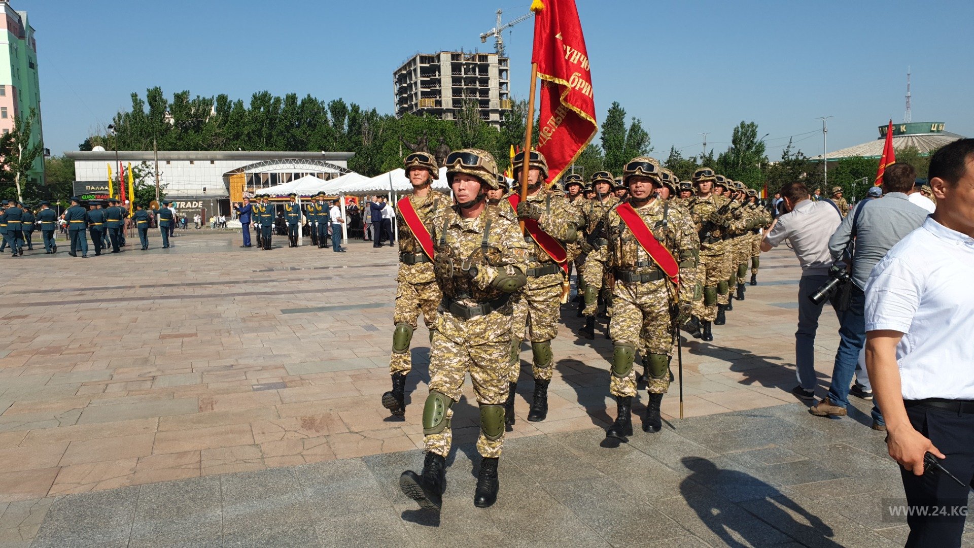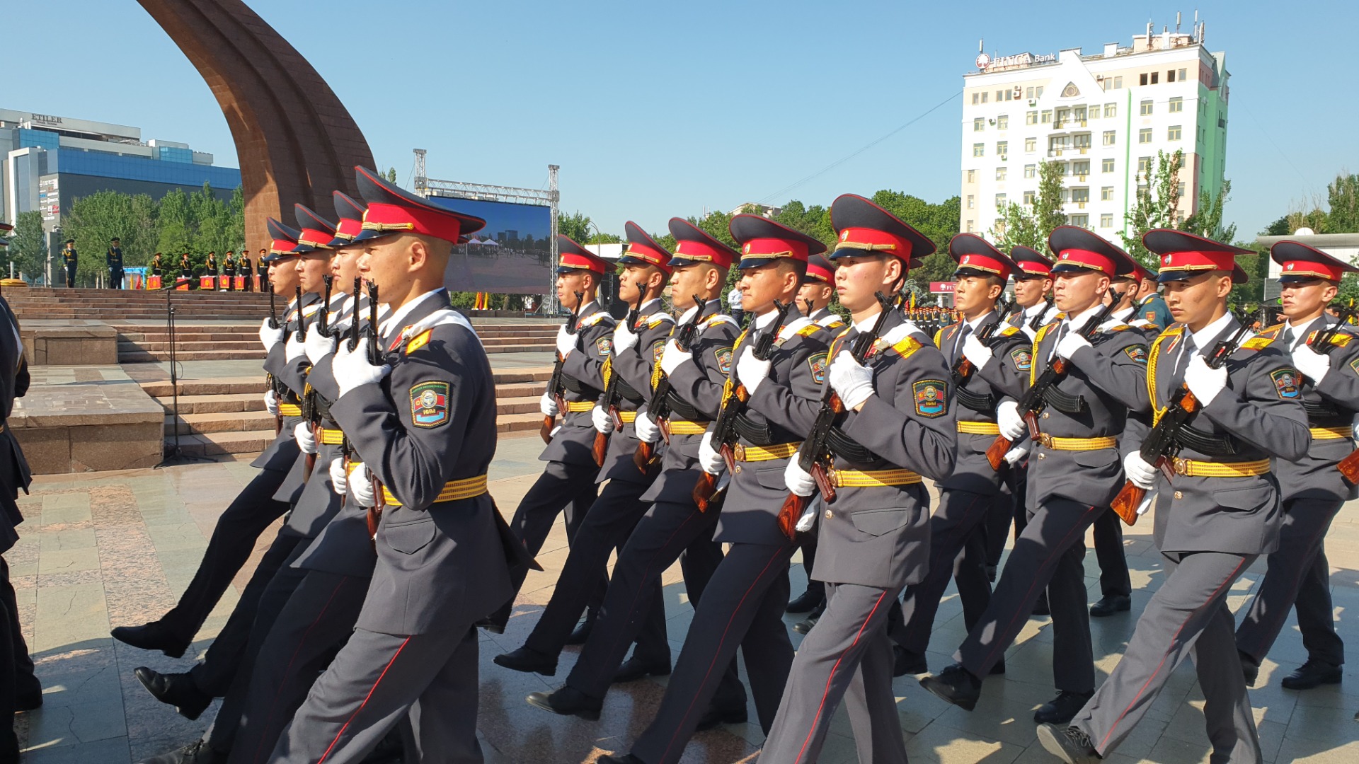 Торжественным маршем по площади прошлись военнослужащие Бишкекского гарнизона Минобороны, Погранслужбы ГКНБ, а также курсанты Военного института, Военного лицея имени Даира Асанова и Академии МВД.