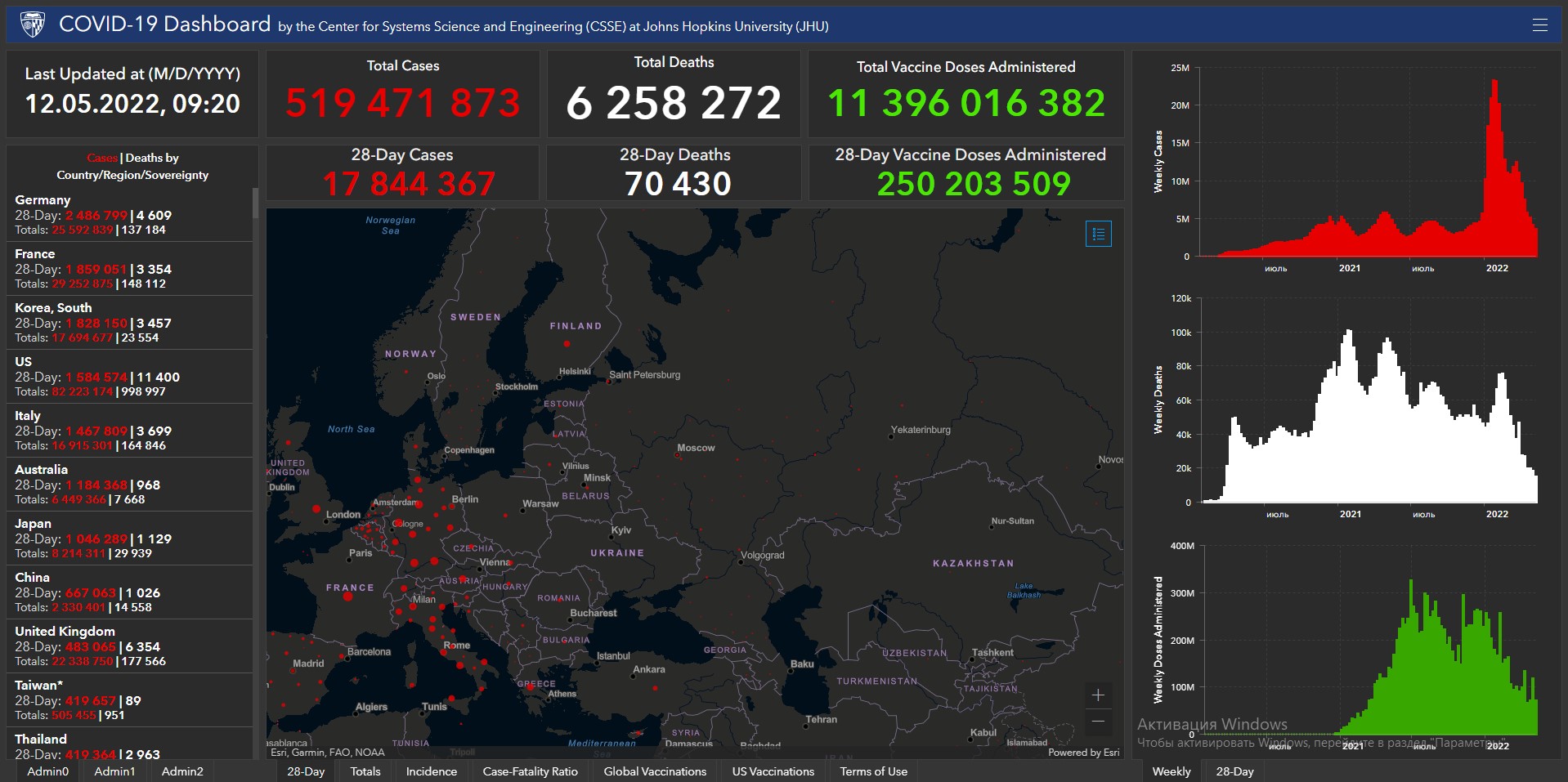 Всего в мире с начала пандемии коронавирусом заразились 519 миллионов 471 тысяча 873 человека. Больше всего в США (82 миллиона 223 тысячи 174), Индии (43 миллиона 110 тысяч 586), Бразилии (30 миллионов 617 тысяч 786), Франции (29 миллионов 252 тысячи 875), Великобритании (22 миллиона 338 тысяч 750), России (17 миллионов 975 тысяч 243), Турции (15 миллионов 48 тысяч 449), Аргентине (9 миллионов 101 тысяча 319), Иране (7 миллионов 226 тысяч 672), Колумбии (6 миллионов 93 тысячи 645), Испании (12 миллионов 58 тысяч 888), Италии (16 миллионов 915 тысяч 301) и Германии (25 миллионов 592 тысячи 839).