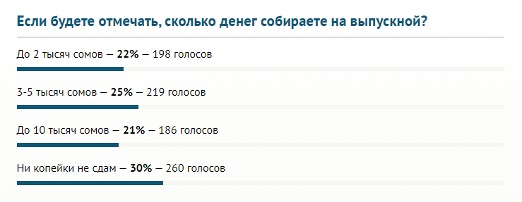 При этом 30 процентов респондентов ответили, что не будут сдавать деньги на выпускной. Четверть проголосовавших собирают от 3 до 5 тысяч сомов, сборы 22 процентов респондентов составляют в пределах 2 тысяч сомов. Еще 21 процент ответили, что они собирают до 10 тысяч сомов.Ранее сообщалось о запрете гуляний и праздничных мероприятий после завершения торжественных линеек, дорогих платьев и причесок, денежных сборов. Делают это в целях безопасности учащихся.