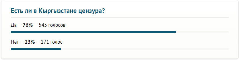 В опросе приняли участие 716 человек. Из них 76 процентов (545) считают, что цензура есть. 23 процента (171) ответили, что цензуры нет.