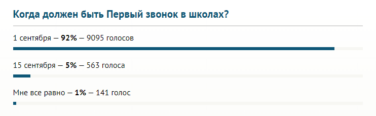 Более 90 процентов респондентов (или более 9 тысяч голосов) ответили, что Первый звонок должен быть 1 сентября. Лишь 5 процентов (563 голоса) согласны с нововведением чиновников, перенесших старт уроков на 15 сентября.