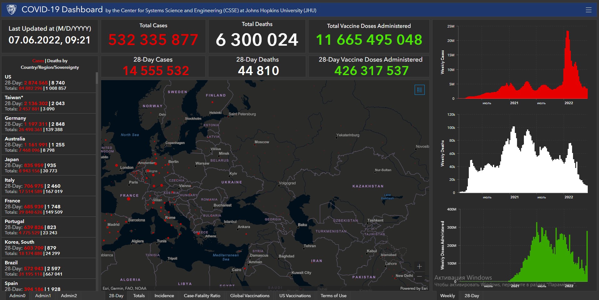 Всего в мире с начала пандемии коронавирусом заразились 532 миллиона 335 тысяч 877 человек. Больше всего в США (84 миллиона 882 тысячи 296), Индии (43 миллиона 181 тысяча 335), Бразилии (31 миллион 195 тысяч 118), Франции (29 миллионов 840 тысяч 626), Великобритании (22 миллиона 526 тысяч 949), России (18 миллионов 87 тысяч 265), Турции (15 миллионов 72 тысячи 747), Аргентине (9 миллионов 276 тысяч 618), Иране (7 миллионов 232 тысячи 790), Колумбии (6 миллионов 109 тысяч 105), Испании (12 миллионов 403 тысячи 245), Италии (17 миллионов 514 тысяч 589) и Германии (26 миллионов 498 тысяч 361).