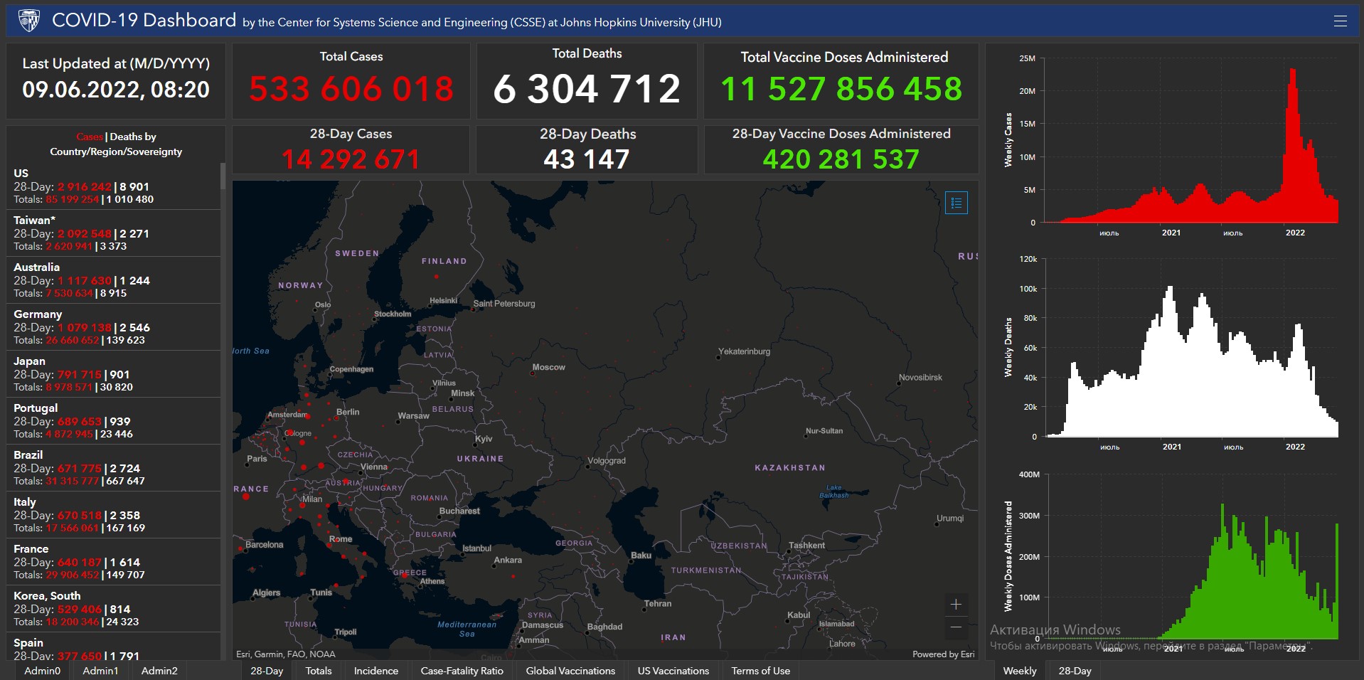 Всего в мире с начала пандемии коронавирусом заразились 533 миллиона 606 тысяч 18 человек. Больше всего в США (85 миллионов 199 тысяч 254), Индии (43 миллиона 190 тысяч 282), Бразилии (31 миллион 315 тысяч 777), Франции (29 миллионов 906 тысяч 452), Великобритании (22 миллиона 551 тысяча 660), России (18 миллионов 94 тысячи 54), Турции (15 миллионов 72 тысячи 747), Аргентине (9 миллионов 276 тысяч 618), Иране (7 миллионов 232 тысячи 790), Колумбии (6 миллионов 109 тысяч 105), Испании (12 миллионов 436 тысяч 538), Италии (17 миллионов 566 тысяч 61) и Германии (26 миллионов 660 тысяч 652).