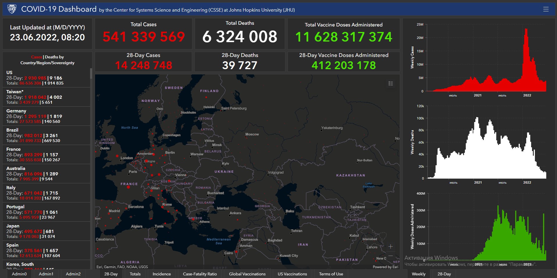 Всего в мире с начала пандемии коронавирусом заразились 541 миллион 339 тысяч 569 человек. Больше всего в США (86 миллионов 636 тысяч 306), Индии (43 миллиона 331 тысяча 645), Бразилии (31 миллион 890 тысяч 733), Франции (30 миллионов 555 тысяч 38), Великобритании (22 миллиона 751 тысяча 393), России (18 миллионов 137 тысяч 759), Турции (15 миллионов 85 тысяч 742), Аргентине (9 миллионов 341 тысяча 492), Иране (7 миллионов 235 тысяч 440), Колумбии (6 миллионов 131 тысяча 657), Испании (12 миллионов 613 тысяч 634), Италии (18 миллионов 14 тысяч 202) и Германии (27 миллионов 573 тысячи 585).