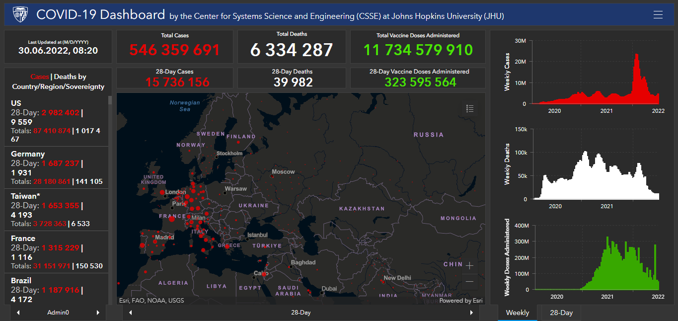 Всего в мире с начала пандемии коронавирусом заразились 546 миллионов 359 тысяч 691 человек. Больше всего в США (87 миллионов 410 тысяч 874), Индии (43 миллиона 433 тысячи 345), Бразилии (32 миллиона 206 тысяч 954), Франции (31 миллион 151 тысяча 971), Великобритании (22 миллиона 895 тысяч 669), России (18 миллионов 158 тысяч 163), Турции (15 миллионов 123 тысячи 331), Аргентине (9 миллионов 367 тысяч 172), Иране (7 миллионов 237 тысяч 597), Колумбии (6 миллионов 151 тысяча 354), Испании (12 миллионов 734 тысячи 38), Италии (18 миллионов 438 тысяч 877) и Германии (28 миллионов 180 тысяч 861).