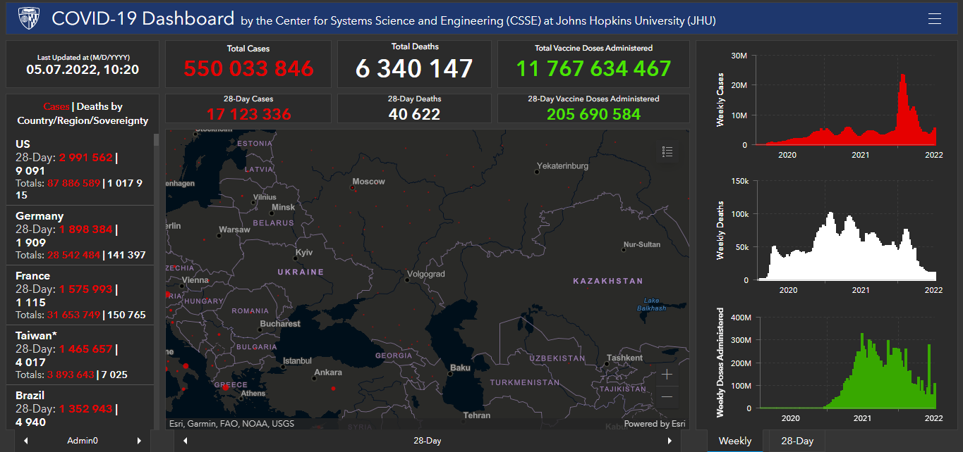 Всего в мире с начала пандемии коронавирусом заразились 550 миллионов 33 тысячи 846 человек. Больше всего в США (87 миллионов 886 тысяч 589), Индии (43 миллиона 518 тысяч 564), Бразилии (32 миллиона 535 тысяч 923), Франции (31 миллион 653 тысячи 749), Великобритании (22 миллиона 941 тысяча 382), России (18 миллионов 173 тысячи 480), Турции (15 миллионов 180 тысяч 444), Аргентине (9 миллионов 394 тысячи 326), Иране (7 миллионов 240 тысяч 564), Колумбии (6 миллионов 175 тысяч 181), Испании (12 миллионов 818 тысяч 184), Италии (18 миллионов 805 тысяч 756) и Германии (28 миллионов 542 тысячи 484).