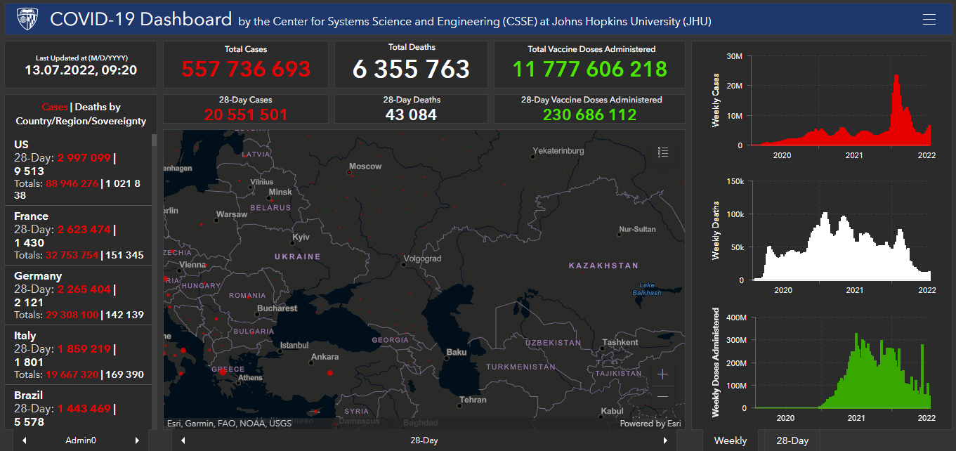 Всего в мире с начала пандемии коронавирусом заразились 557 миллионов 736 тысяч 693 человека. Больше всего в США (88 миллионов 946 тысяч 276), Индии (43 миллиона 652 тысячи 944), Бразилии (33 миллиона 4 тысячи 555), Франции (32 миллиона 753 тысячи 754), Великобритании (23 миллиона 88 тысяч 446), России (18 миллионов 198 тысяч 890), Турции (15 миллионов 180 тысяч 444), Аргентине (9 миллионов 426 тысяч 171), Иране (7 миллионов 255 тысяч 17), Колумбии (6 миллионов 198 тысяч 848), Испании (13 миллионов 32 тысячи 841), Италии (19 миллионов 667 тысяч 320) и Германии (29 миллионов 308 тысяч 100).