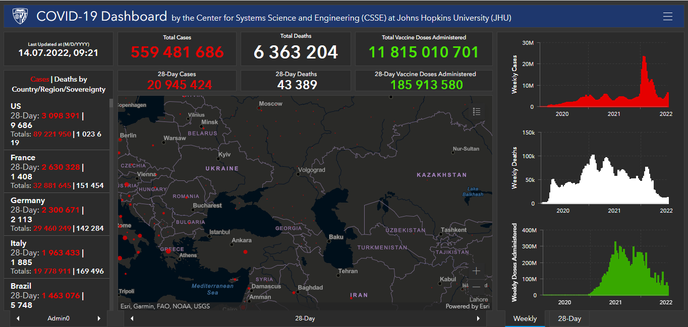 Всего в мире с начала пандемии коронавирусом заразились 559 миллионов 481 тысяча 686 человек. Больше всего в США (89 миллионов 221 тысяча 950), Индии (43 миллиона 669 тысяч 850), Бразилии (33 миллиона 76 тысяч 779), Франции (32 миллиона 881 тысяча 645), Великобритании (23 миллиона 280 тысяч 870), России (18 миллионов 202 тысячи 785), Турции (15 миллионов 297 тысяч 539), Аргентине (9 миллионов 426 тысяч 171), Иране (7 миллионов 260 тысяч 17), Колумбии (6 миллионов 198 тысяч 848), Испании (13 миллионов 32 тысячи 841), Италии (19 миллионов 778 тысяч 911) и Германии (29 миллионов 460 тысяч 249).