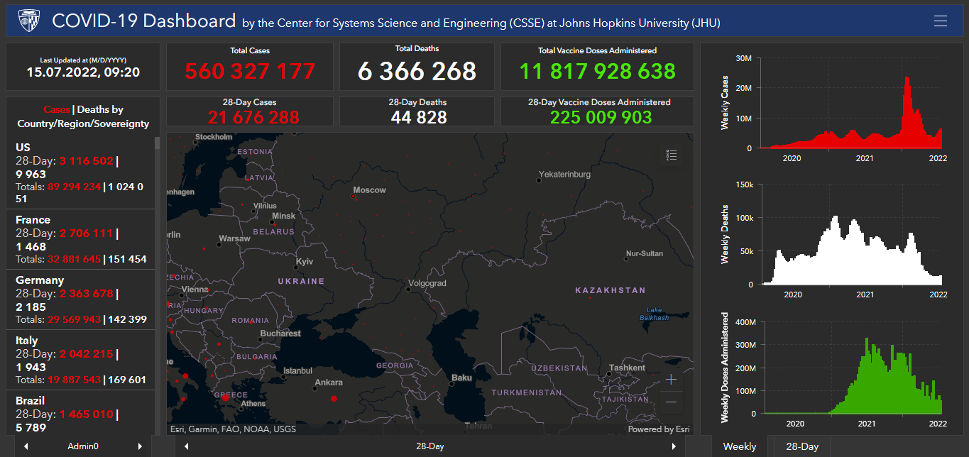 Всего в мире с начала пандемии коронавирусом заразились 560 миллионов 327 тысяч 177 человек. Больше всего в США (89 миллионов 294 тысячи 234), Индии (43 миллиона 689 тысяч 989), Бразилии (33 миллиона 142 тысячи 158), Франции (32 миллиона 881 тысяча 645), Великобритании (23 миллиона 280 тысяч 957), России (18 миллионов 206 тысяч 982), Турции (15 миллионов 297 тысяч 539), Аргентине (9 миллионов 426 тысяч 171), Иране (7 миллионов 265 тысяч 261), Колумбии (6 миллионов 223 тысячи 497), Испании (13 миллионов 32 тысячи 841), Италии (19 миллионов 887 тысяч 543) и Германии (29 миллионов 569 тысяч 943).