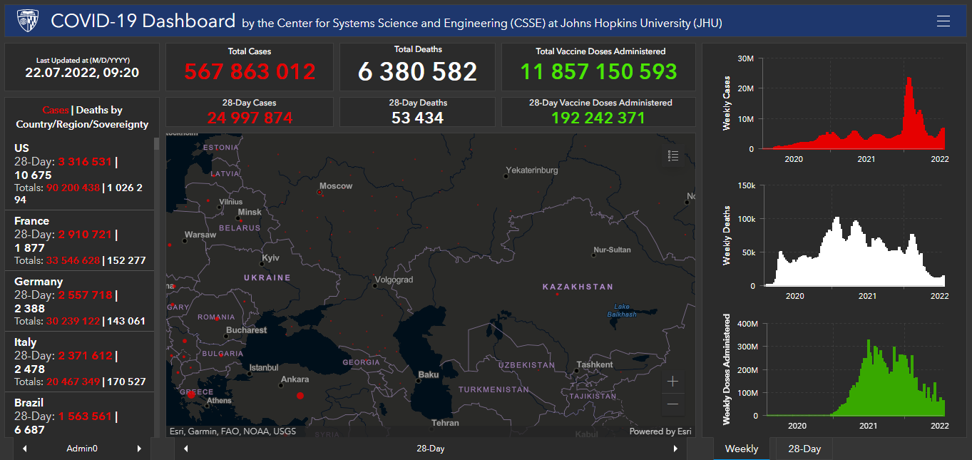 Всего в мире с начала пандемии коронавирусом заразились 567 миллионов 863 тысячи 12 человек. Больше всего в США (90 миллионов 200 тысяч 438), Индии (43 миллиона 825 тысяч 185), Бразилии (33 миллиона 505 тысяч 727), Франции (32 миллиона 546 тысяч 628), Великобритании (23 миллиона 421 тысяча 574), России (18 миллионов 241 тысяча 184), Турции (15 миллионов 524 тысячи 71), Аргентине (9 миллионов 465 тысяч 827), Иране (7 миллионов 304 тысячи 550), Колумбии (6 миллионов 247 тысяч 634), Испании (13 миллионов 132 тысячи 159), Италии (20 миллионов 467 тысяч 349) и Германии (30 миллионов 239 тысяч 122).