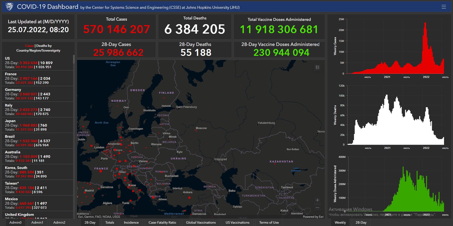 Всего в мире с начала пандемии коронавирусом заразились 570 миллионов 146 тысяч 207 человек. Больше всего в США (90 миллионов 410 тысяч 386), Индии (43 миллиона 888 тысяч 755), Бразилии (33 миллиона 591 тысяча 356), Франции (32 миллиона 621 тысяча 366), Великобритании (23 миллиона 422 тысячи 751), России (18 миллионов 262 тысячи 88), Турции (15 миллионов 524 тысячи 71), Аргентине (9 миллионов 507 тысяч 562), Иране (7 миллионов 328 тысяч 153), Колумбии (6 миллионов 247 тысяч 634), Испании (13 миллионов 204 тысячи 863), Италии (20 миллионов 660 тысяч 65) и Германии (30 миллионов 331 тысяча 133).