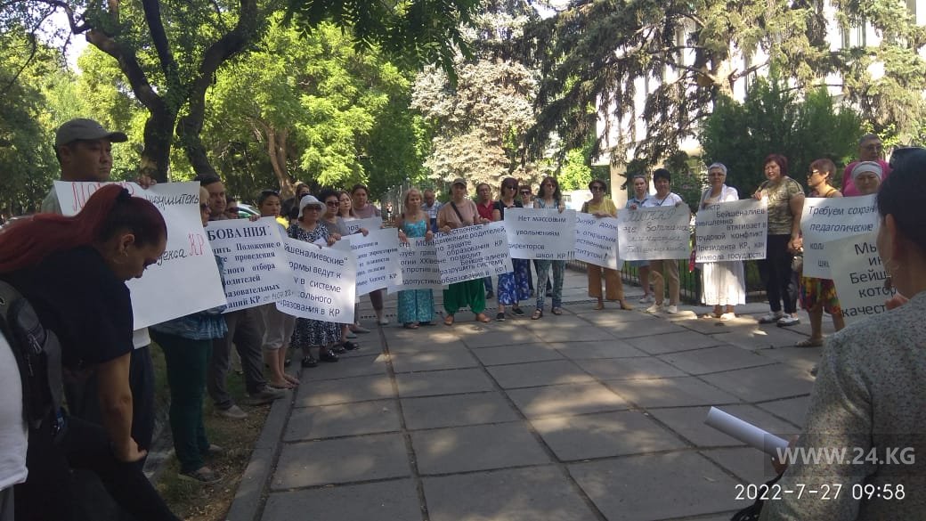 «Проведенный и широко разрекламированный министерством первый пилотный конкурс по отбору директоров школ-интернатов Таласской области был целиком провальным и показал полную несостоятельность инициатив министра Бейшеналиева в кадровом вопросе. Из семи претендентов только один прошел все процедуры конкурса. Широкая общественность не ознакомлена с итогами тестирования, и документацией претендентов», — говорят участники акции протеста.