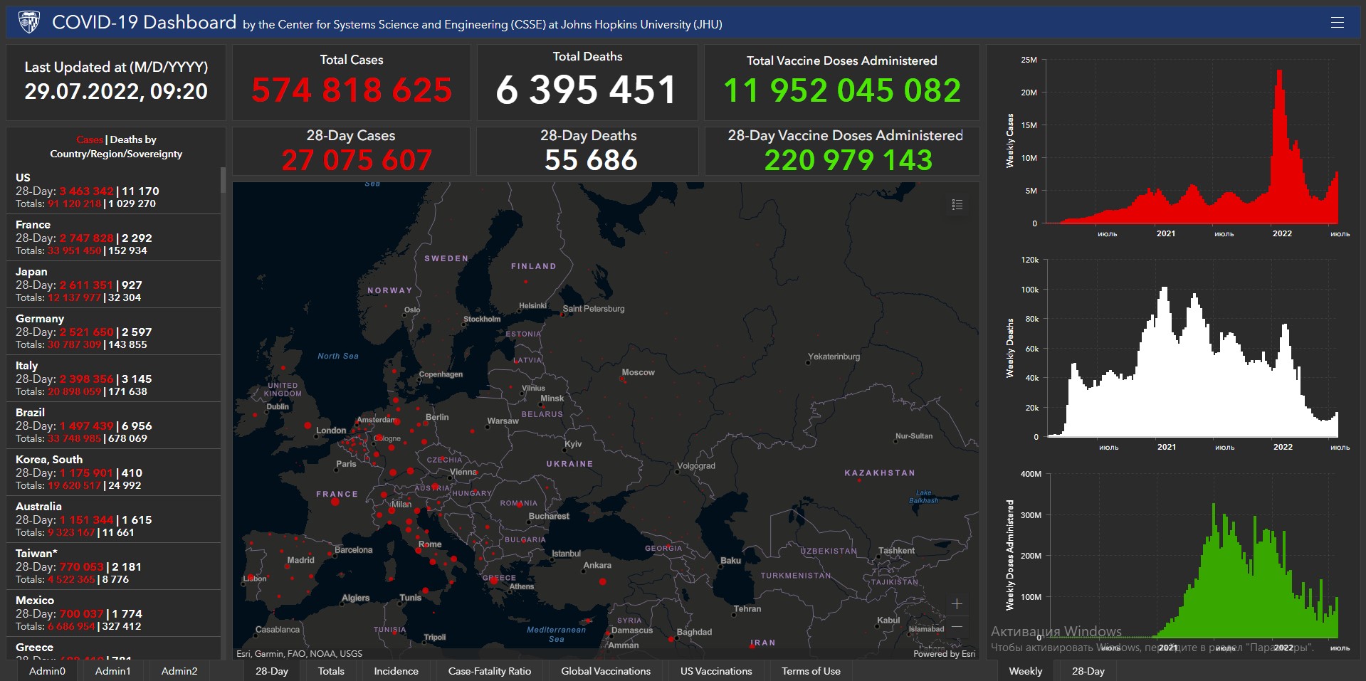 Всего в мире с начала пандемии коронавирусом заразились 574 миллиона 818 тысяч 628 человек. Больше всего в США (91 миллион 120 тысяч 218), Индии (43 миллиона 959 тысяч 321), Бразилии (33 миллиона 748 тысяч 985), Франции (33 миллиона 951 тысяча 450), Великобритании (23 миллиона 515 тысяч 417), России (18 миллионов 295 тысяч 35), Турции (15 миллионов 524 тысячи 71), Аргентине (9 миллионов 507 тысяч 562), Иране (7 миллионов 368 тысяч 945), Колумбии (6 миллионов 265 тысяч 798), Испании (13 миллионов 203 тысячи 228), Италии (20 миллионов 898 тысяч 59) и Германии (30 миллионов 787 тысяч 309).